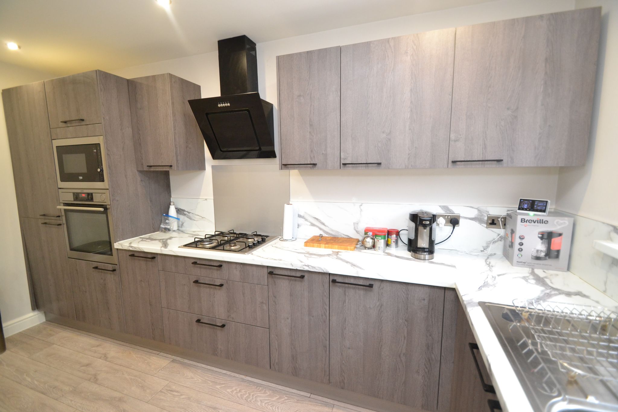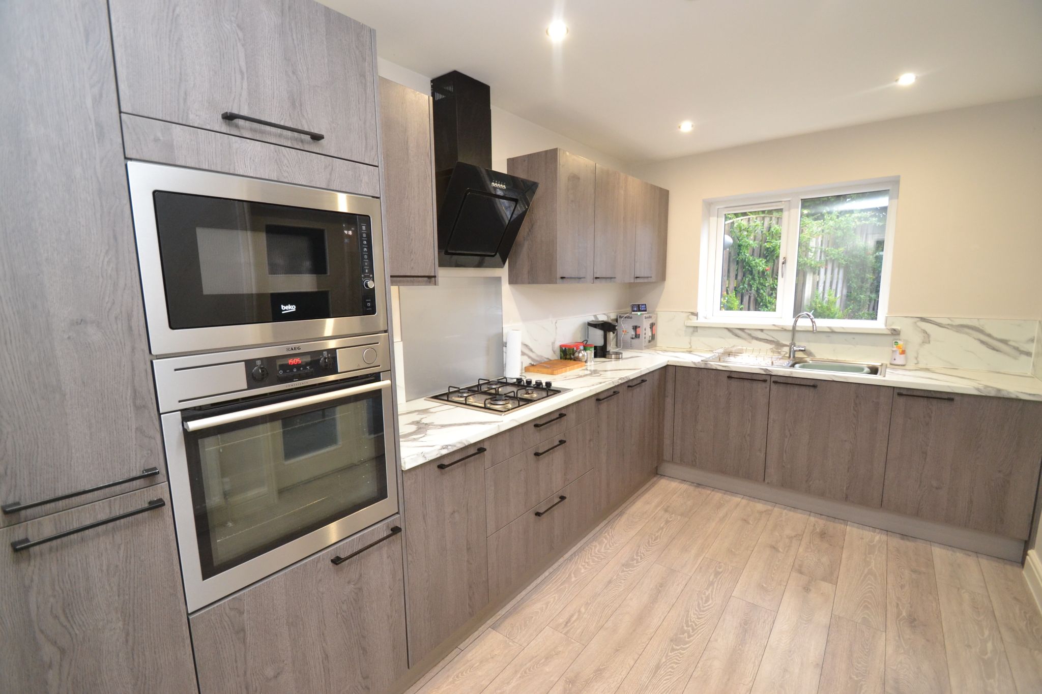 Kitchen: 4.19m x 2.47m (13'7 x 8'10). Excellent range of modern contemporary units, work tops, glass extractor and light with glass splash back over an integrated 4 ring Flavel stainless steel gas hob, built in microwave by Beko and an electric oven by AEG, Flavel integrated dishwasher, integrated fridge and freezer, inset ceiling lights, laminate floor, Upvc dg window to rear, radiator.