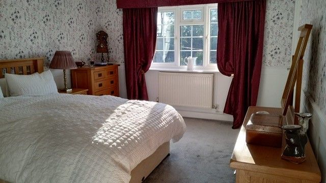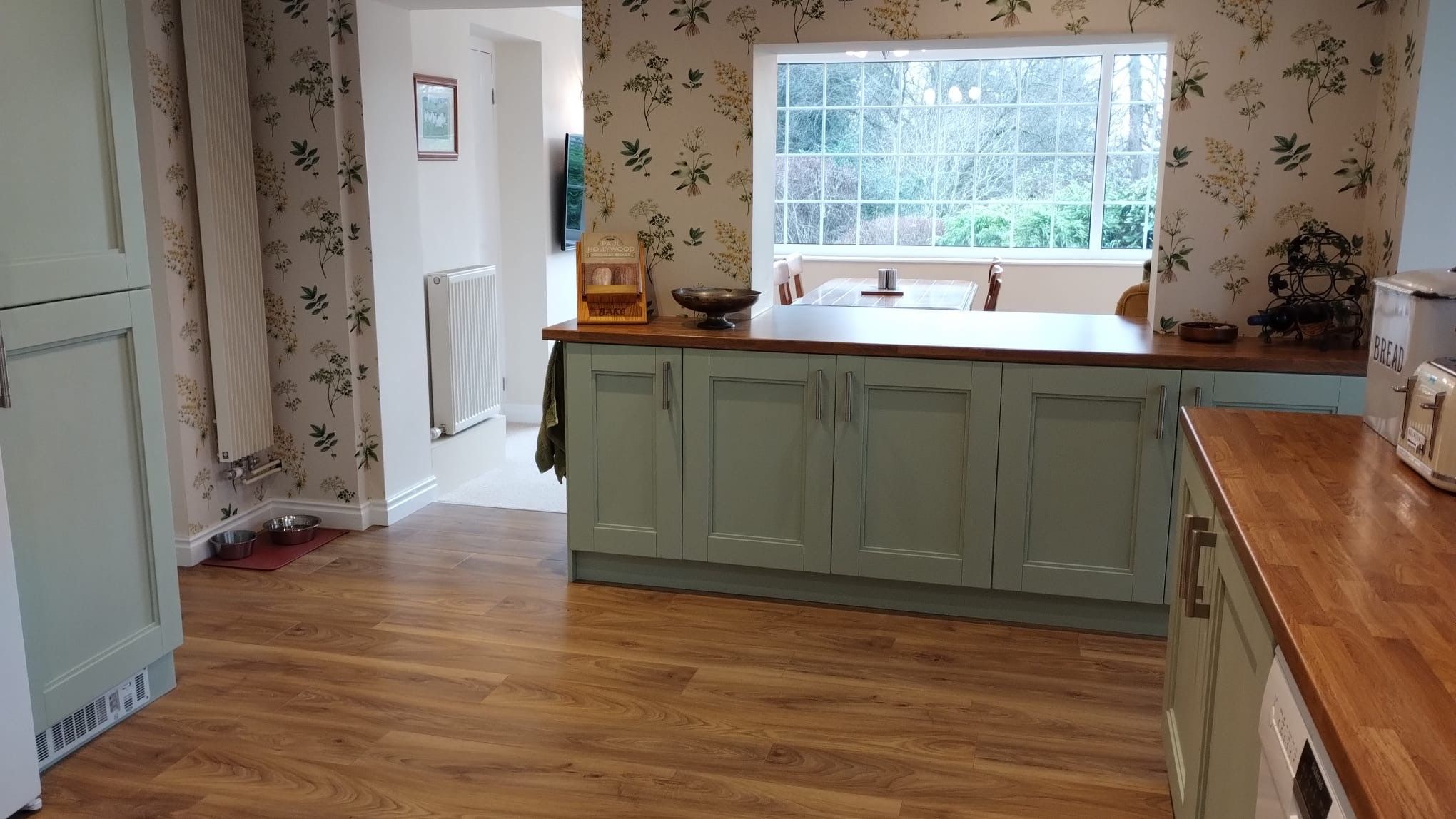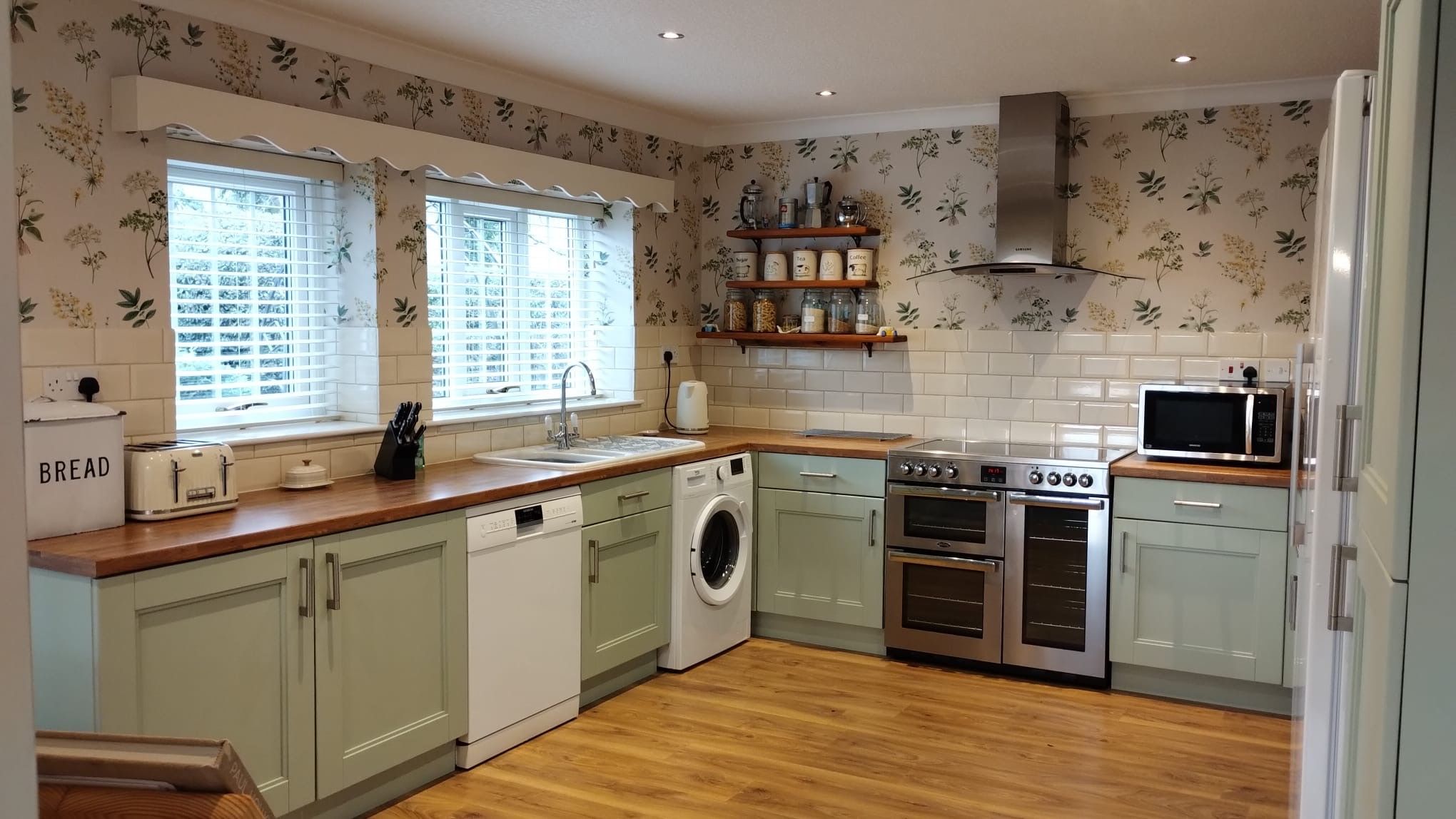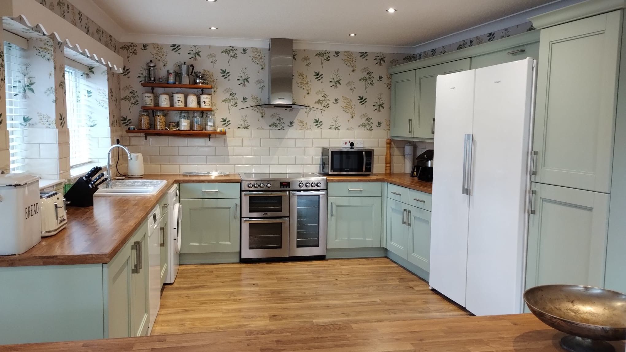 Kitchen: 4.96m x 4.29m (16’3” x 14’1”) Country kitchen shaker style cabinets in sage green with wood effect worktops, laminate flooring, range style electric oven, ch radiator, coving. Space for washer, dishwasher and tall upright fridge and freezer. Windows overlooking the front of the property with cream slatted venetian blinds.