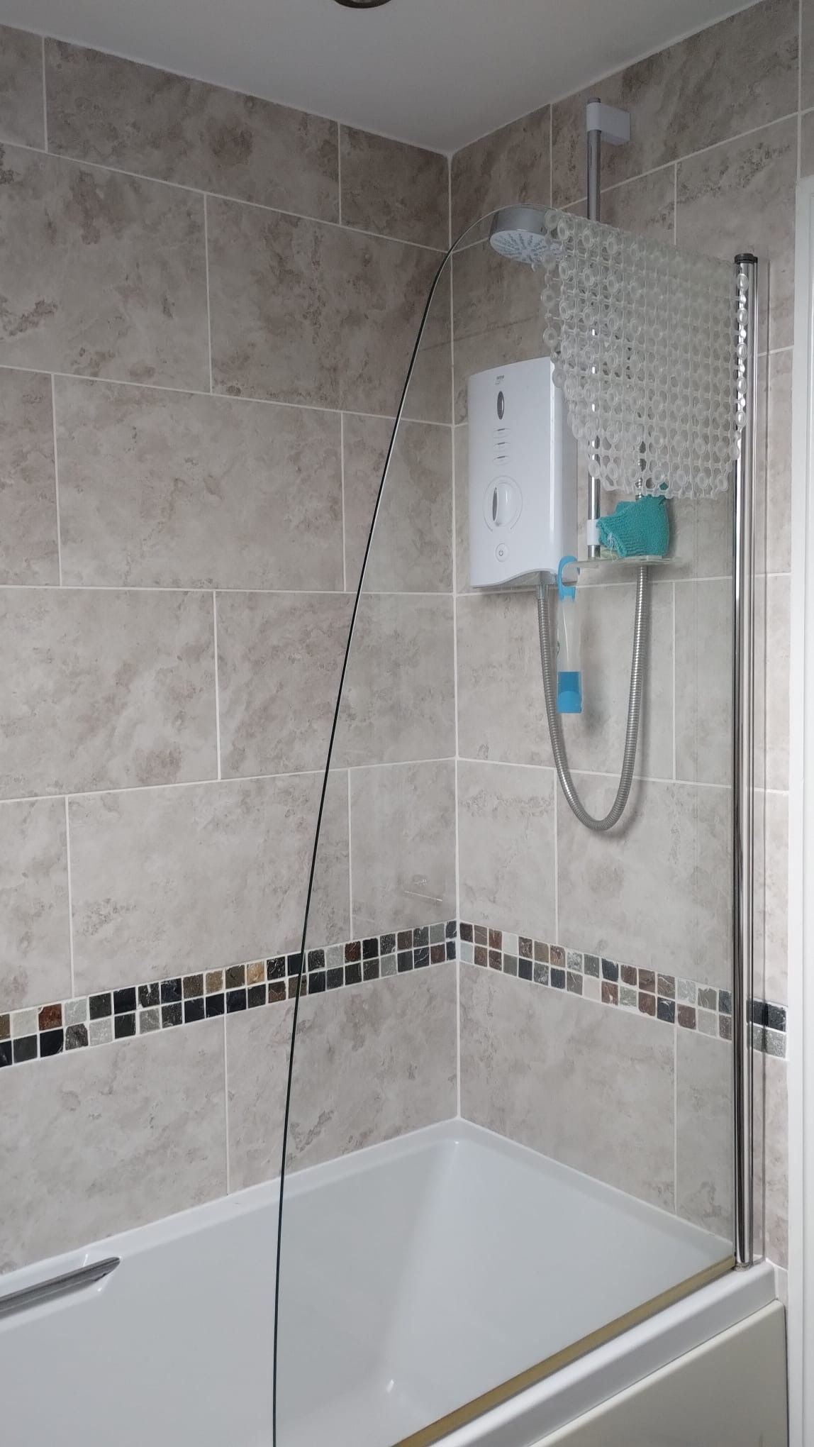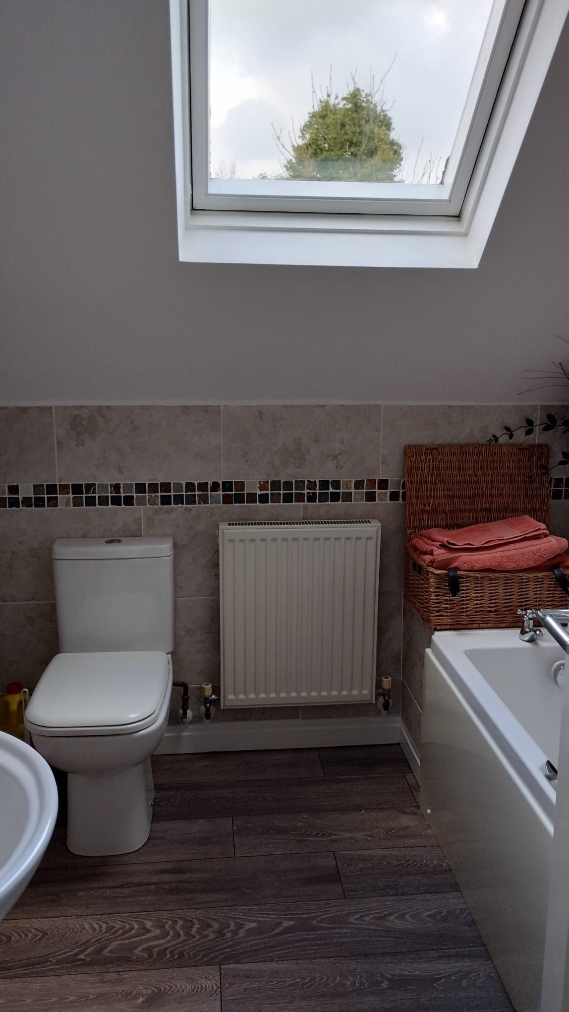House bathroom: 2.02m x 1.97m (6’8” x 6’6”) Three piece suite in white with chrome fittings, electric shower over bath with glass shower screen. Fully tiled with inset border, laminate flooring, velux window.