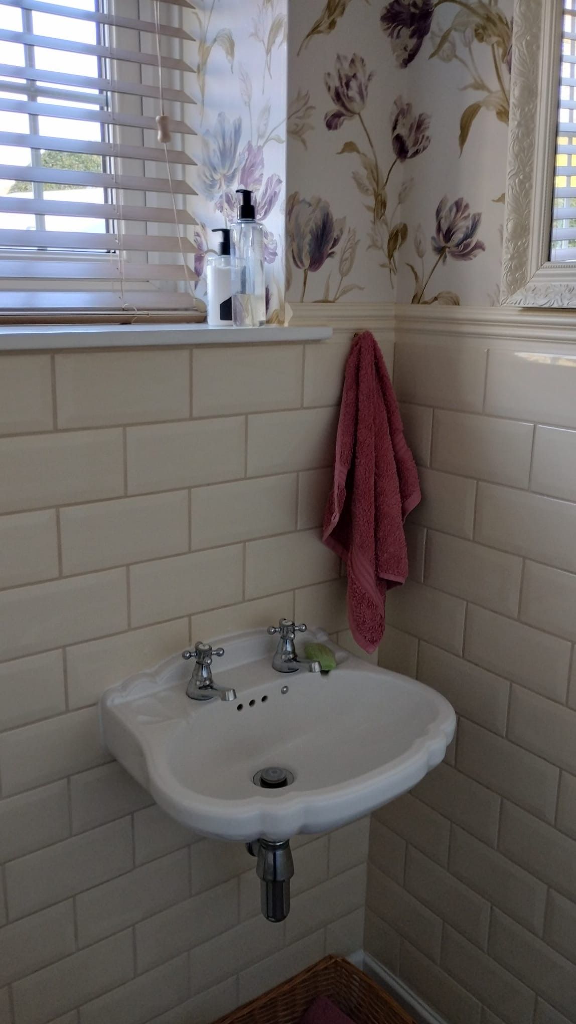 Downstairs cloakroom: 1.34m x 1.34m (4’5” x 4’5”) Half tiled in cream metro tiles, WC and basin. Window overlooking the front.