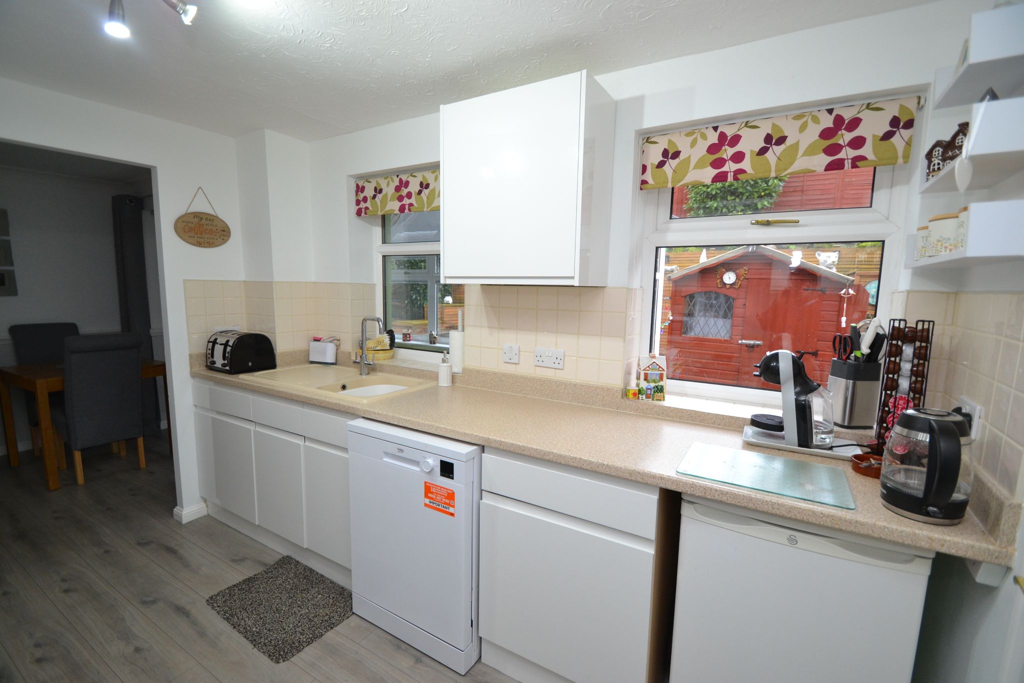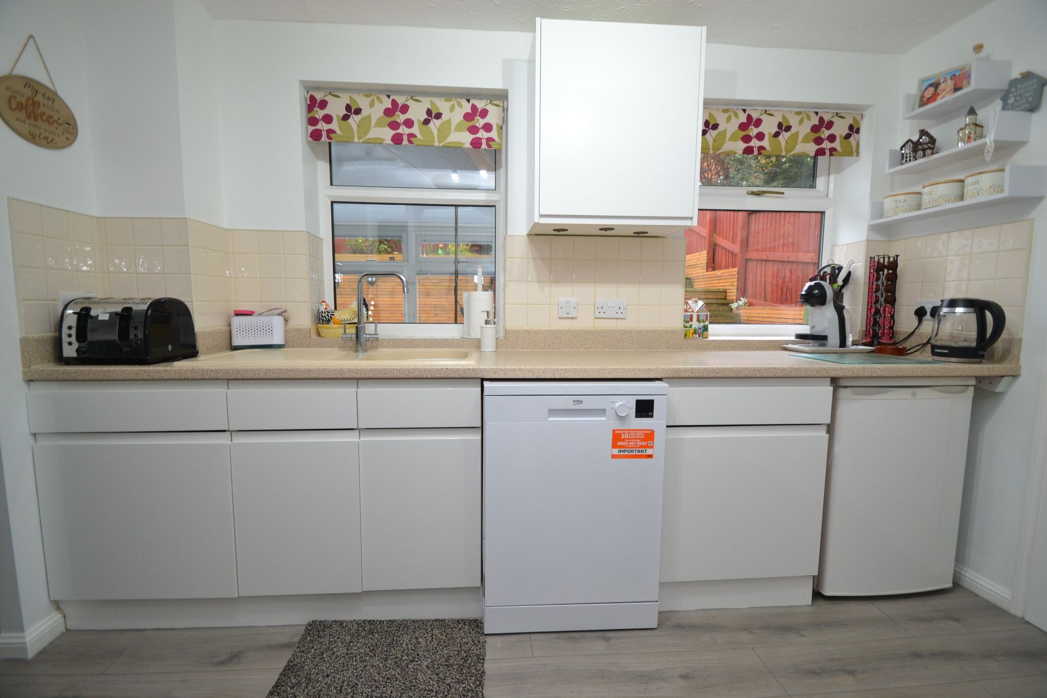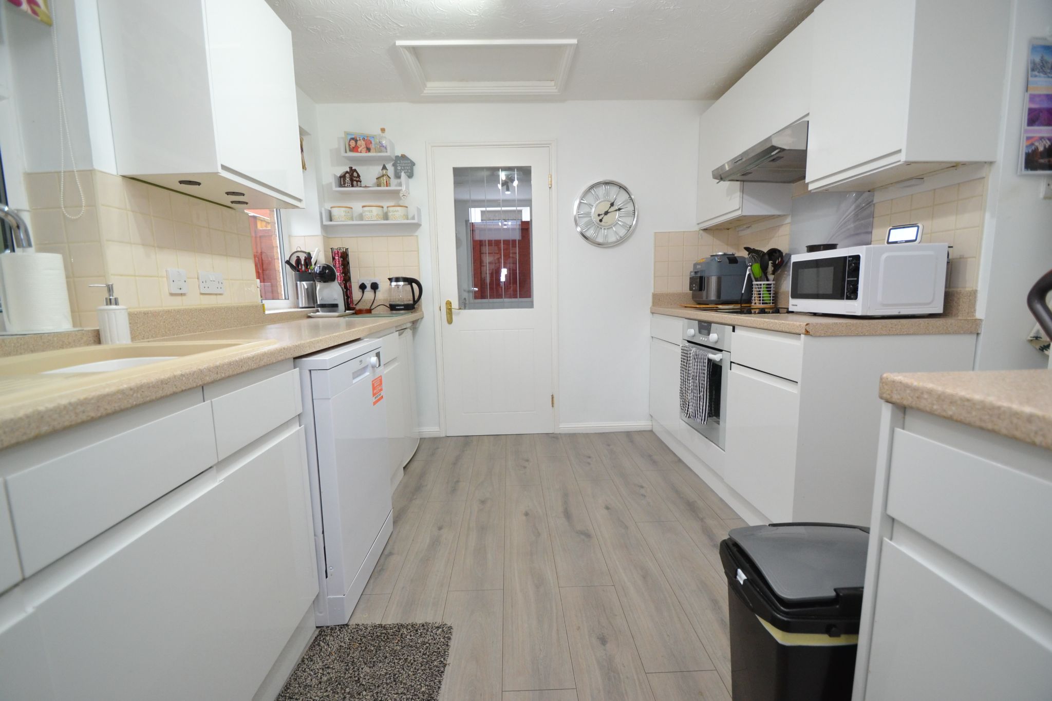 Kitchen: 3.32m x 3.04m (10'8 x 9'9). Range of wall & base units in high gloss white, work tops with splash backs and tiling above, two Upvc dg windows to rear, plumbed for a dishwasher, ceramic hob with an exctractor and light hood over, built in electric oven, sink with a chrome mixer tap, space for a fridge, under stairs pantry cupboard.