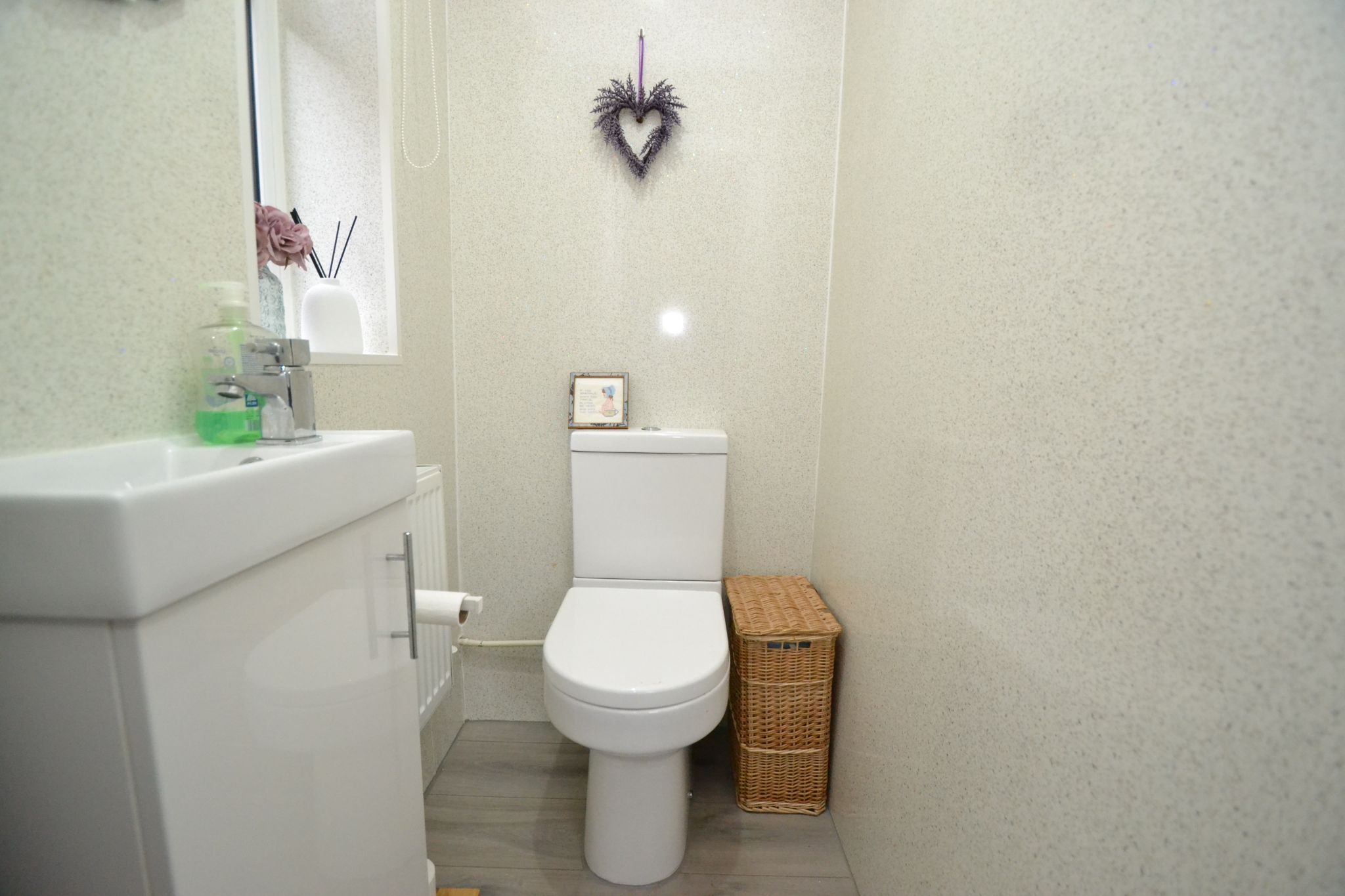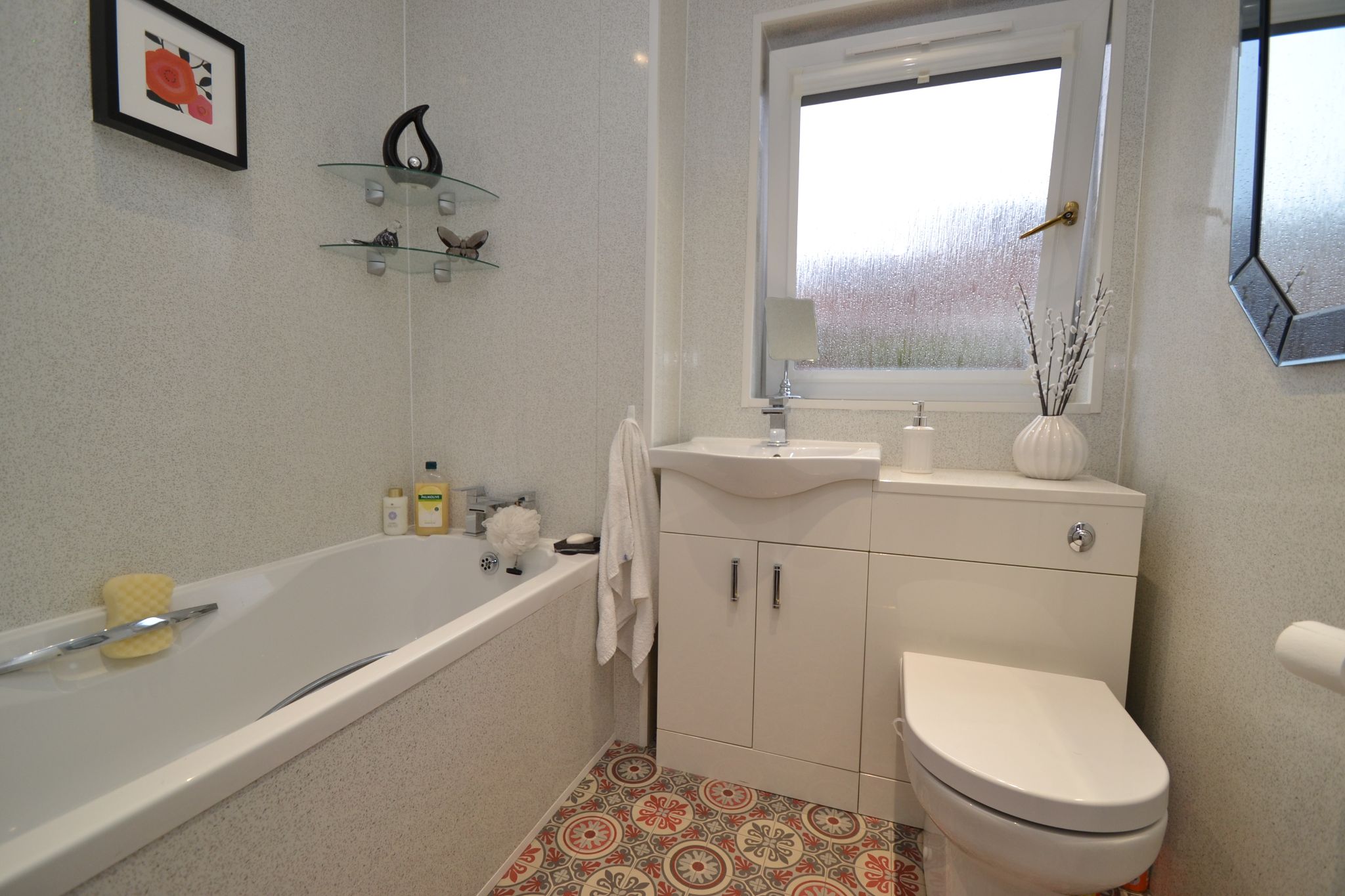 Bathroom: 1,90m x 1.89m (6'2 x 6'1). Three piece suite in white, chrome fittings, wash basin and wc set in a vanity unit and cistern in high gloss white, frosted Upvc dg window, radiator, inset ceiling lights, Upvc claded to walls and ceiling in marble effect.
