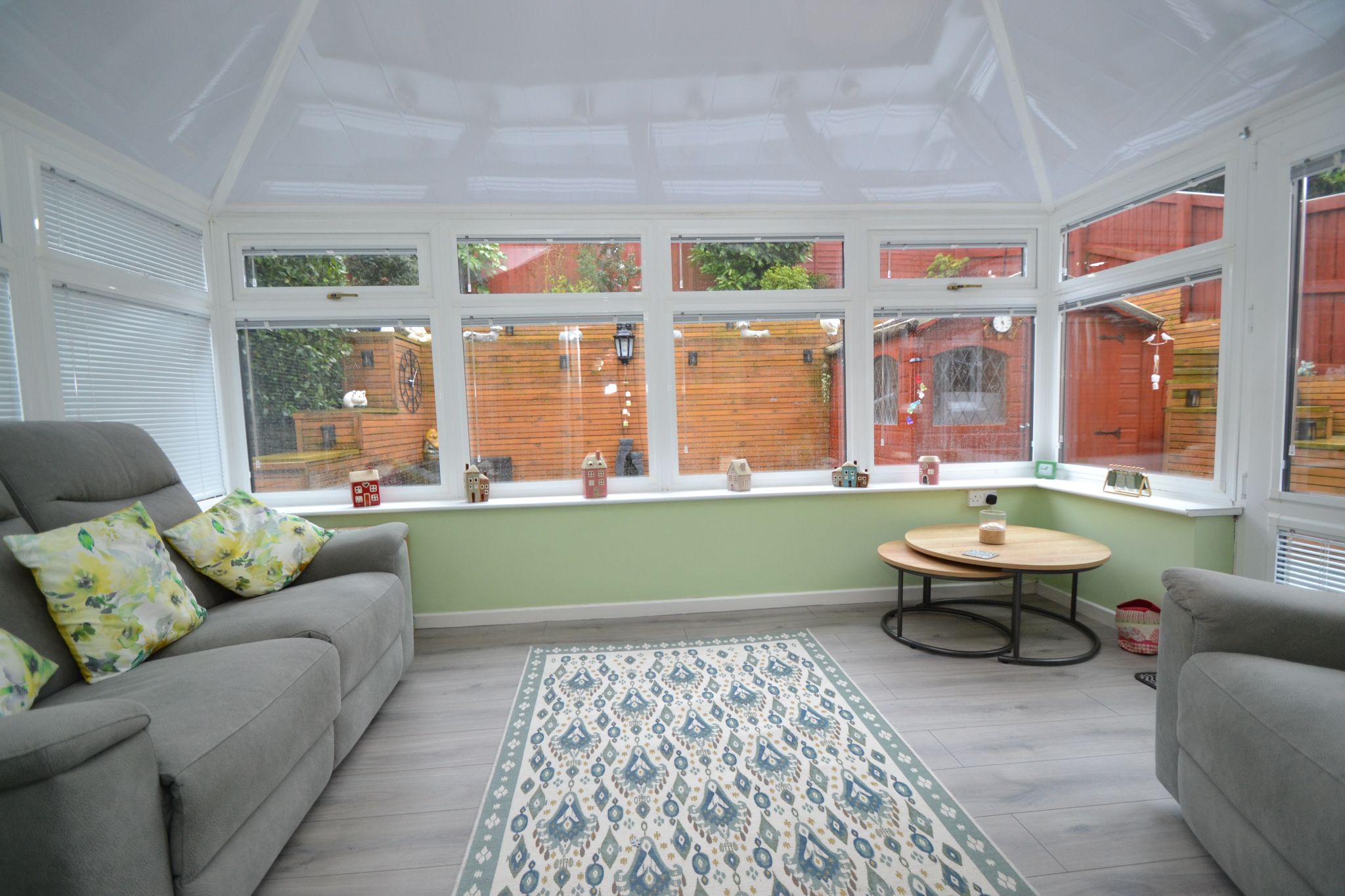 Upvc dg Conservatory: 4.47m x 2.93m (14'6 x 9'6). Access from the dining room, fully insulated, fitted recessed blinds, radiator, side door, plank effect laminate floor in grey, double radiator.