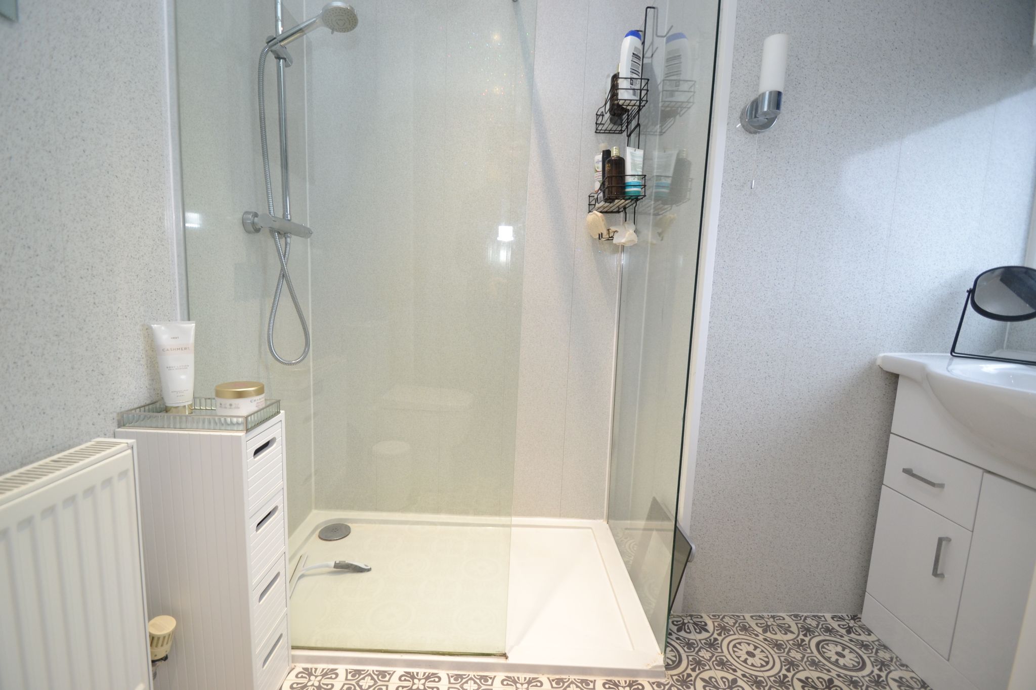 En-Suite: 2.62m x 2.15m (8'5 x 7'0 into the sink area). Walk in shower cubicle with a chrome thermostatically controlled shower unit, wash basin set on a high gloss vanity unit, Upvc cladded walls and ceiling, inset ceiling lights, radiator.