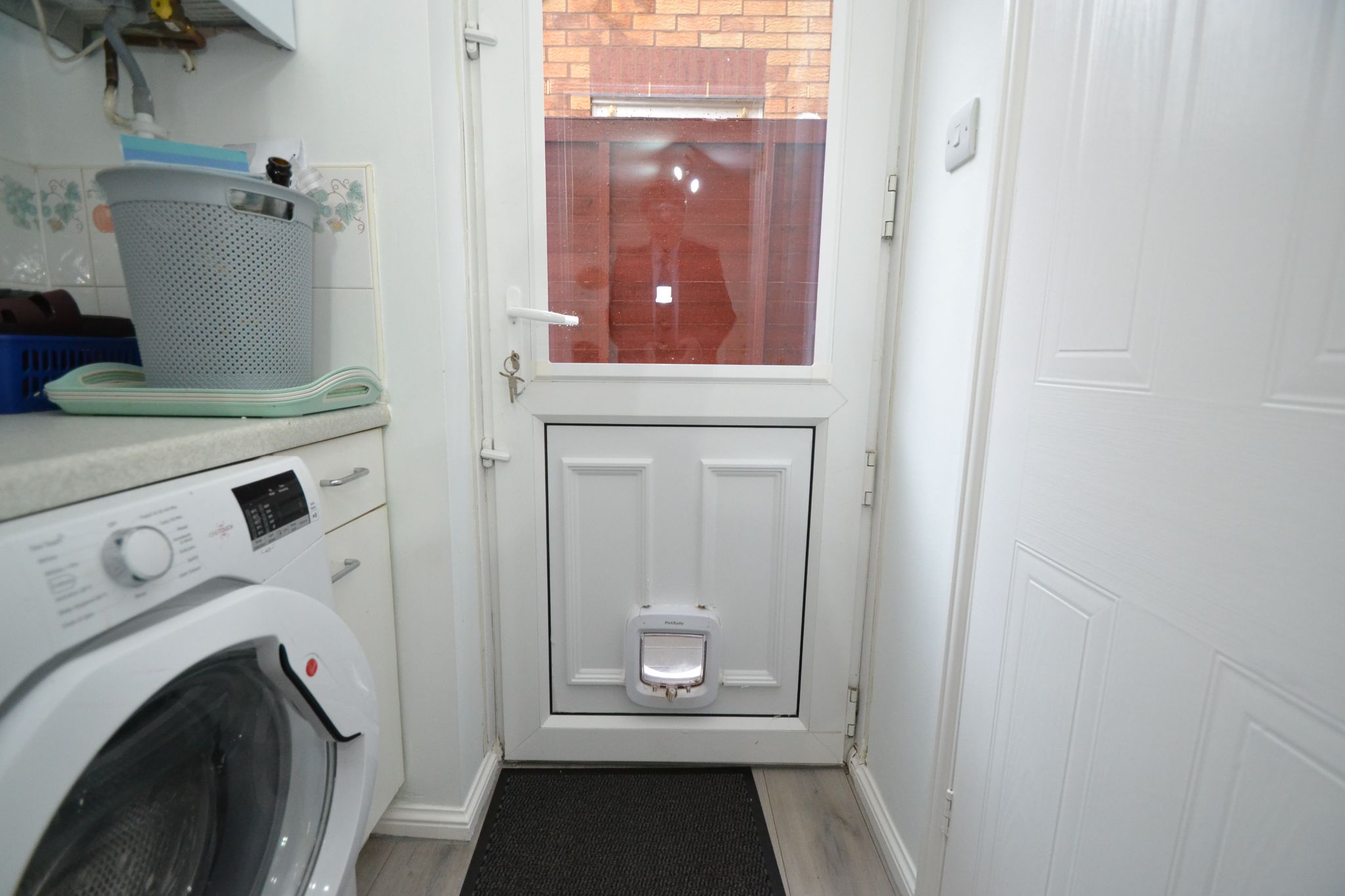 Utility Room: Wall mounted Vaillant Eco Fit pure boiler, work top with plumbing for an auto-washer, side Upvc entrance door, laminate flooring in grey plank effect.