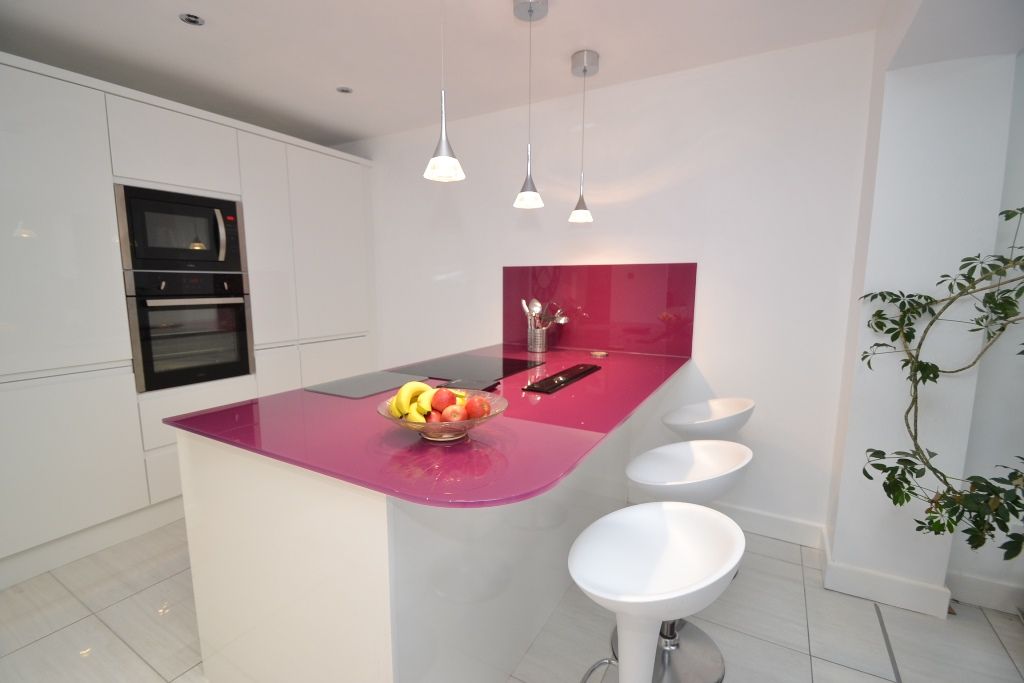 Kitchen to Open Plan Family Room: Excellent range of high gloss units in white with contrasting coloured glass work tops with matching splash backs, stainless steel power points, plumbed for an auto-washer and dishwasher, 1.5 sink in granite effect with a mixer tap, central breakfast island with bar stools and storage, integrated electric cooker and microwave, induction 4 ring hob with pop up extractor hood, pop up power point unit, inset chrome ceiling lights, mood lighting, porcelain tiled floor throughout with under floor heating, rear Upvc dg patio door and side panes.