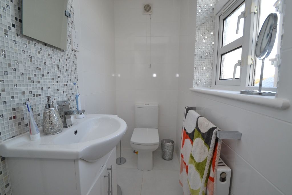 En-Suite: Fully tiled shower cubicle with an electric shower unit, wc and wash basin on a vanity unit, frosted Upvc dg window, electric shaving point.