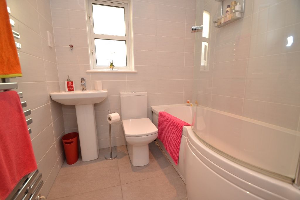 Family Bathroom: Modern P shaped three piece suite in white, fully tiled, glass shower screen with a chrome thermostatically controlled shower unit with two heads, chrome mixer tap, heated chrome towel rail, frosted Upvc dg window, electric shaving point.