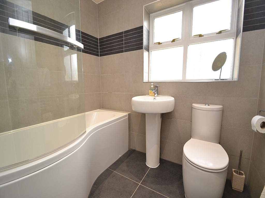 Bathroom: 7'4 x 5'10. P shaped three piece suite in white, contemporary shower screen, thermostatically controlled chrome shower unit over the bath, inset chrome ceiling lights, extractor, fully tiled wall to ceiling, heated chrome towel rail.