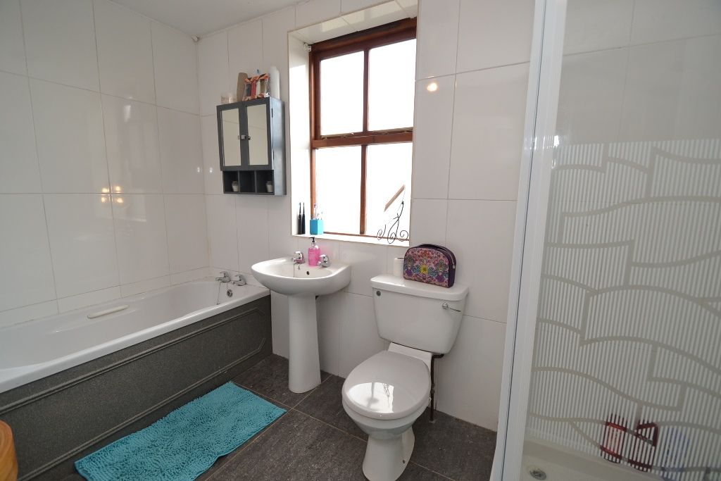 Bathroom: 3.04m x 2.03m (10'0 x 6'7). Four piece suite in white, fully tiled, separate shower cubicle with thermostatically controlled shower unit in chrome, frosted window, extractor, ch radiator.