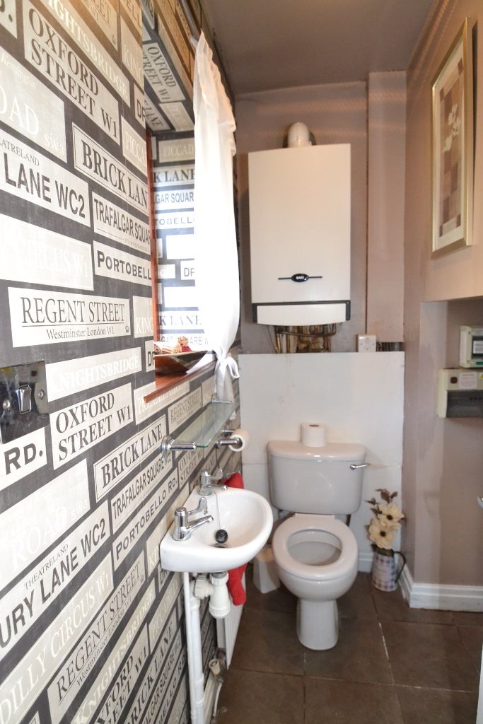 Cloaks wc: Wash basin, wc, plumbed for an auto-washer, Baxi combi-boiler, under stairs storage.