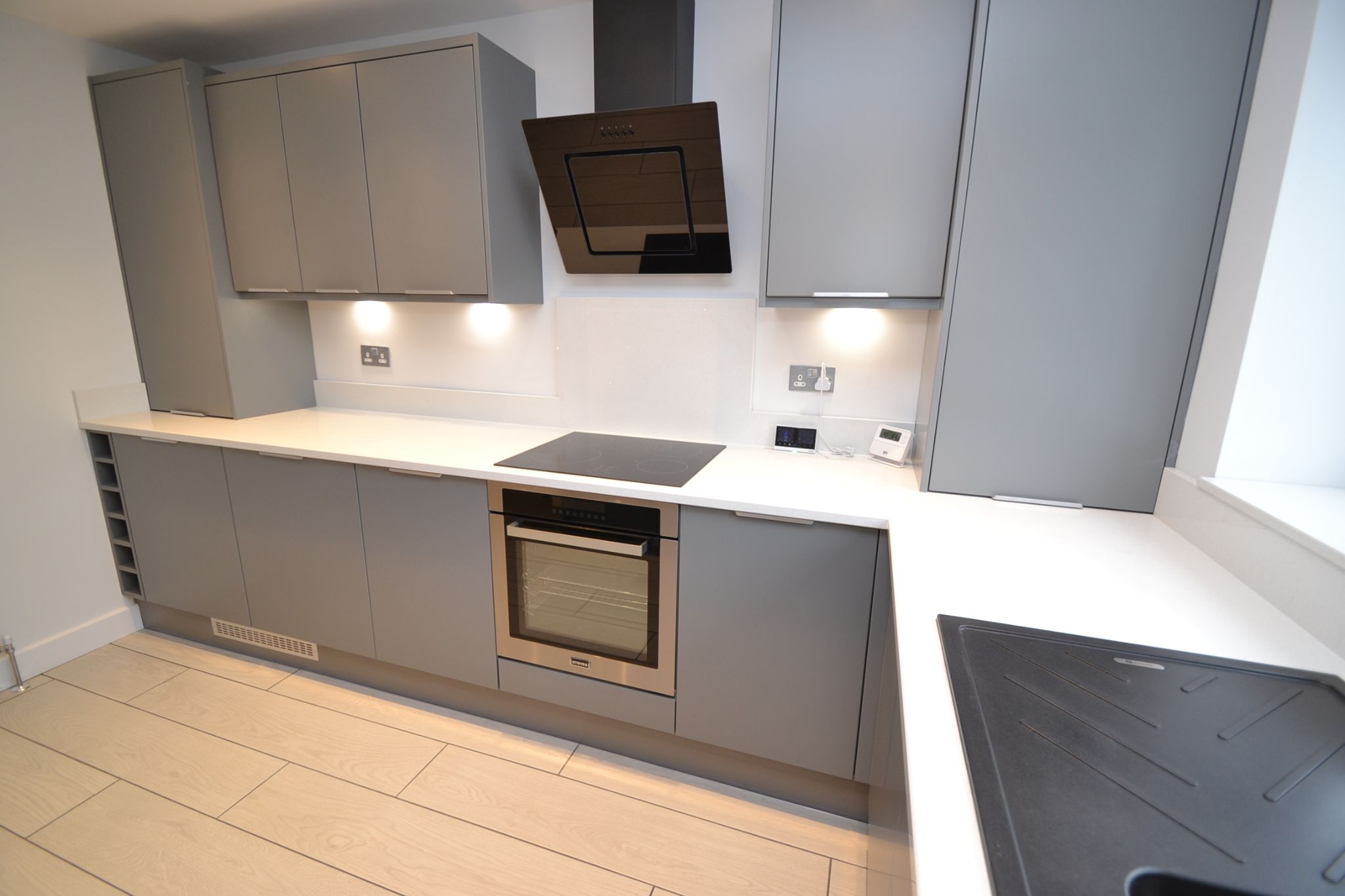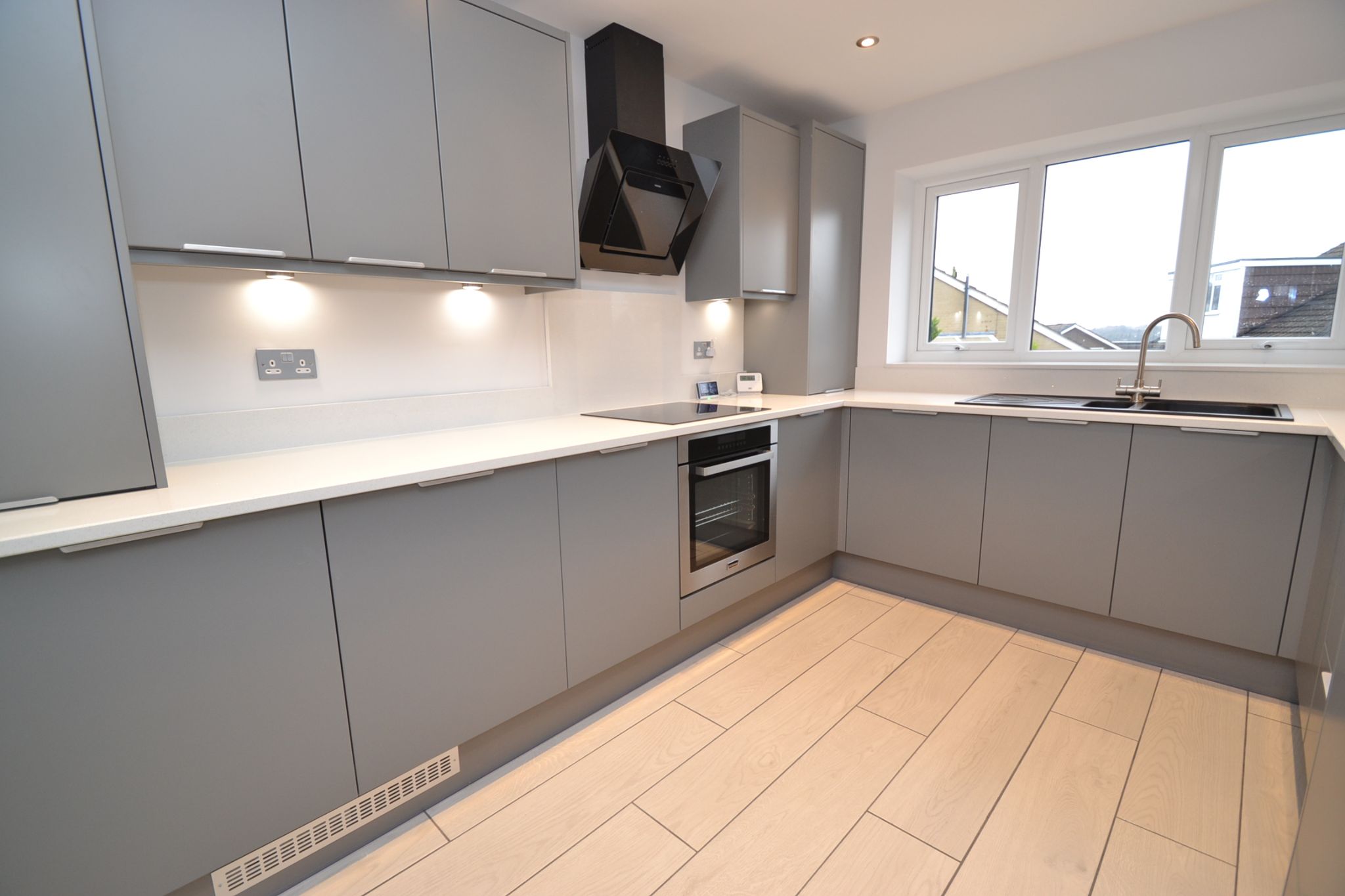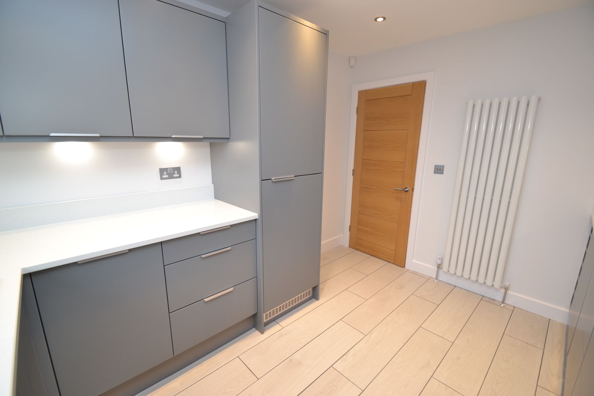 Kitchen: 3.59m x 2.82m (11'7 x 9'2). Excellent range of high quality wall & base units in grey, quartz work tops with matching splash backs, under lighting, integrated heat pump condenser dryer and separate auto-washer, integrated fridge freezer, integrated dishwasher by Gorenje, Stoves integrated electric oven, ceramic 4 ring hob, contemporary part glass extractor over, Vokera condensing boiler in wall unit with wireless thermostat, composite granite effect 1.5 sink with mixer tap, Upvc dg window to rear, inset ceiling lights, contemporary radiator, wood effect laminate tiled floor.
