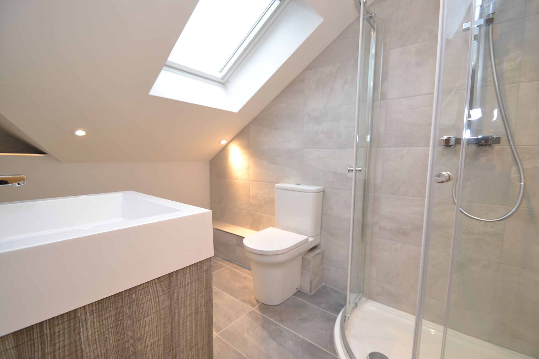 En-Suite: 2.72m x 1.81m (8'9 x 5'9). Wrap around shower cubicle with a chrome thermostaticaly controlled shower unit, wc, and wash basin on a contemporary vanity unit, fully tiled, extractor, heated chrome towel rail, dg velux sky light window, inset ceiling lights.