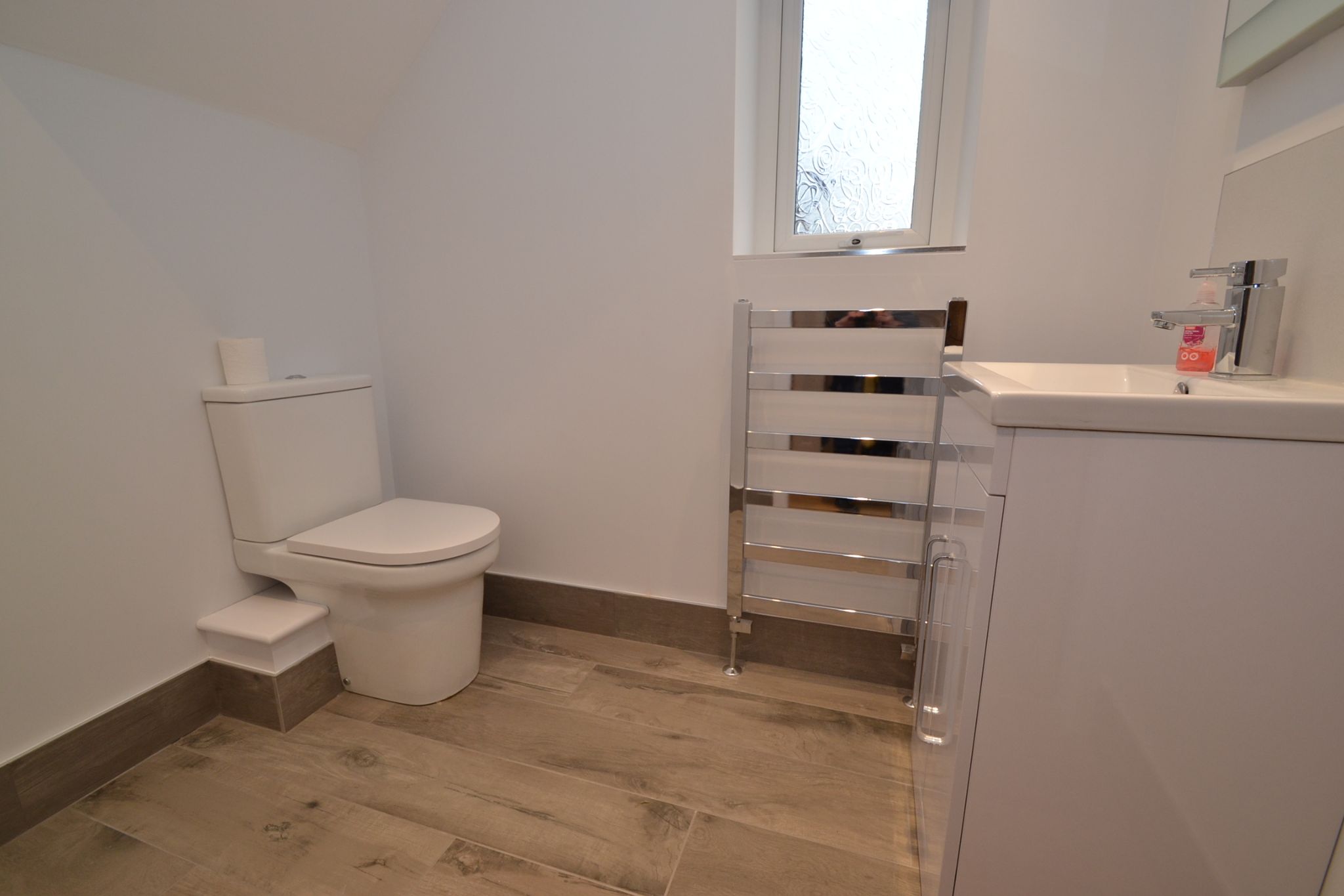 Cloaks: 1.99m x 1.46m (6'5 x 4'7). Low flush wc, wash basin in a high gloss white vanity unit, heated chrome towel rail, frosted Upvc dg window, inset ceiling lights, extractor.