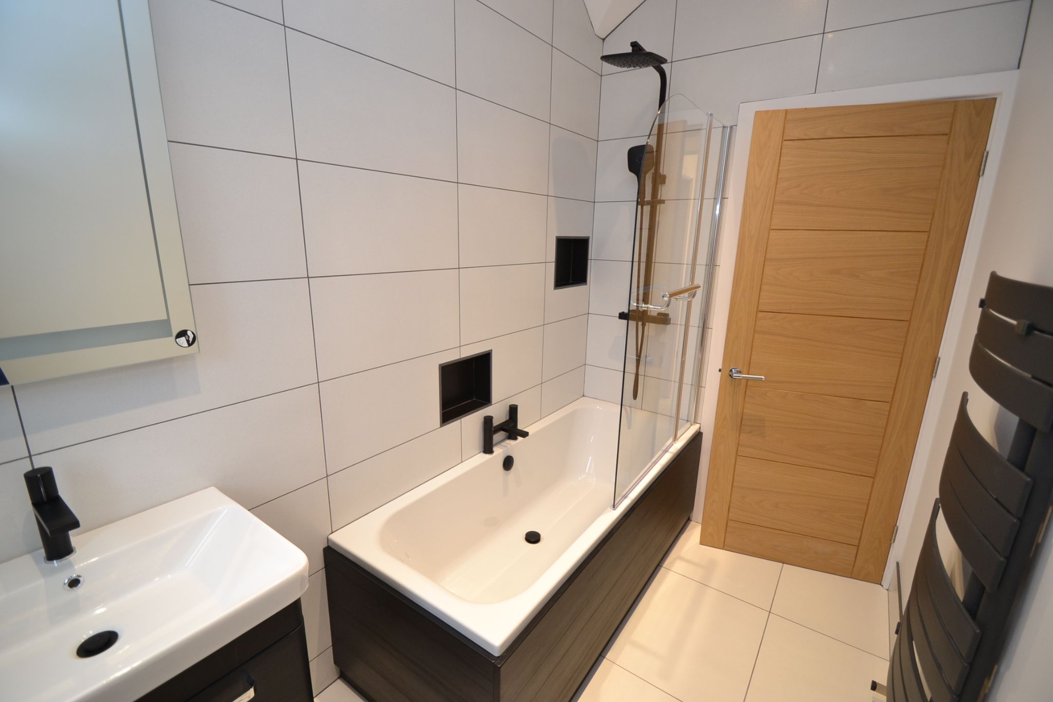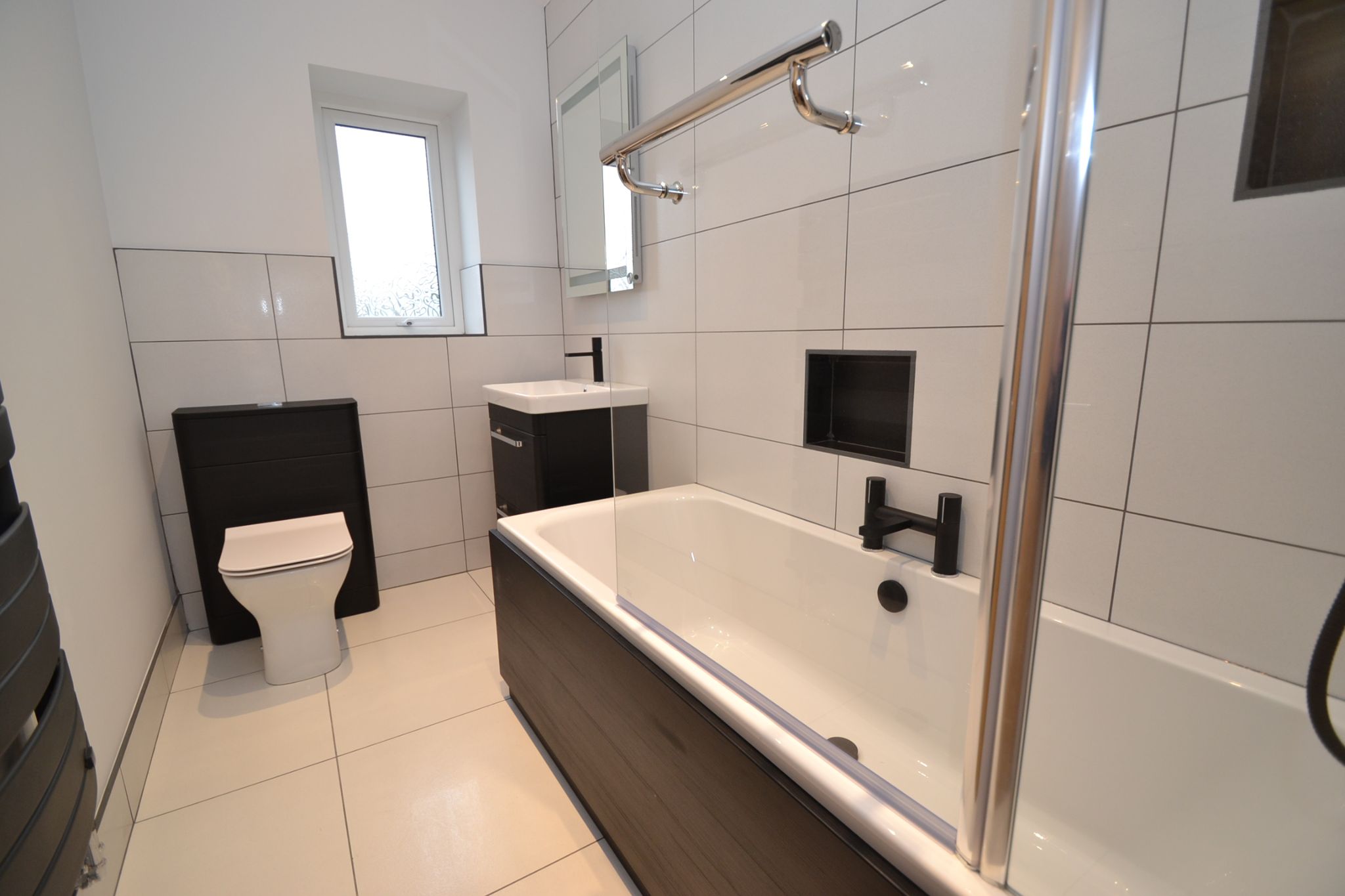 Family Bathroom: 2.76m x 1.56m (9'0 x 5'11). Superb contemporary three piece suite in white with chrome fittings, black mixer tap along with a contrasting shower unit in black over the bath with two inset feature soap and cosmetic display recesses, wash basin on a vanity unit, enclosed wc in white, touch vanity mirror, modern feature towel rail in black, tiled floor, frosted Upvc dg window, extractor, inset ceiling lights.