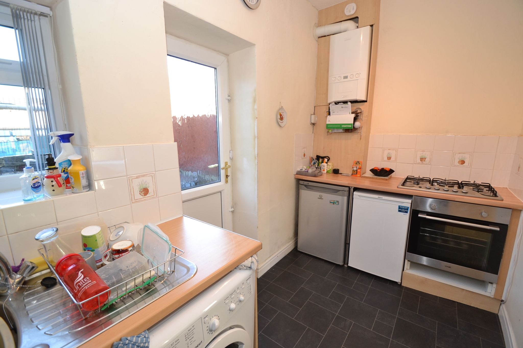 Kitchen: 3.78m x 1.80m (12'4 x 5'9). Range of wall & base units, work tops with tiling above, Ideal Logic 30 condensing boiler, 5 ring gas hob and built in electric oven all in stainless steel, space for a fridge and freezer, plumbed for an auto-washer, frosted Upvc dg window to rear with fitted blind, rear Upvc door.