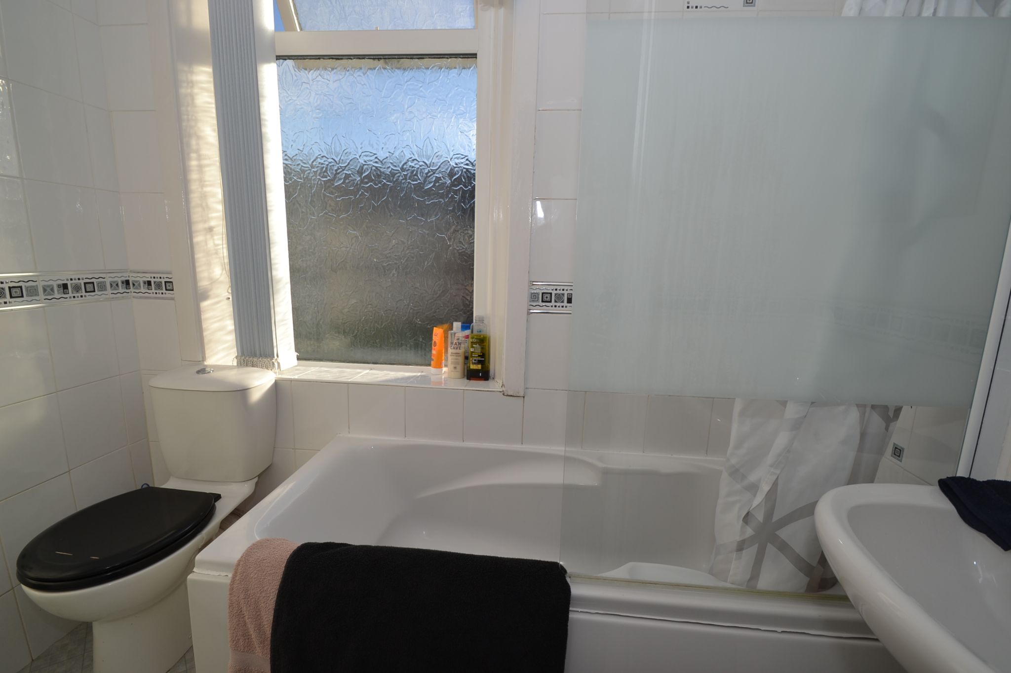Bathroom: Three piece suite in white, chrome fittings, fully tiled, chrome shower mixer tap, glass screen, frosted Upvc dg window, radiator.