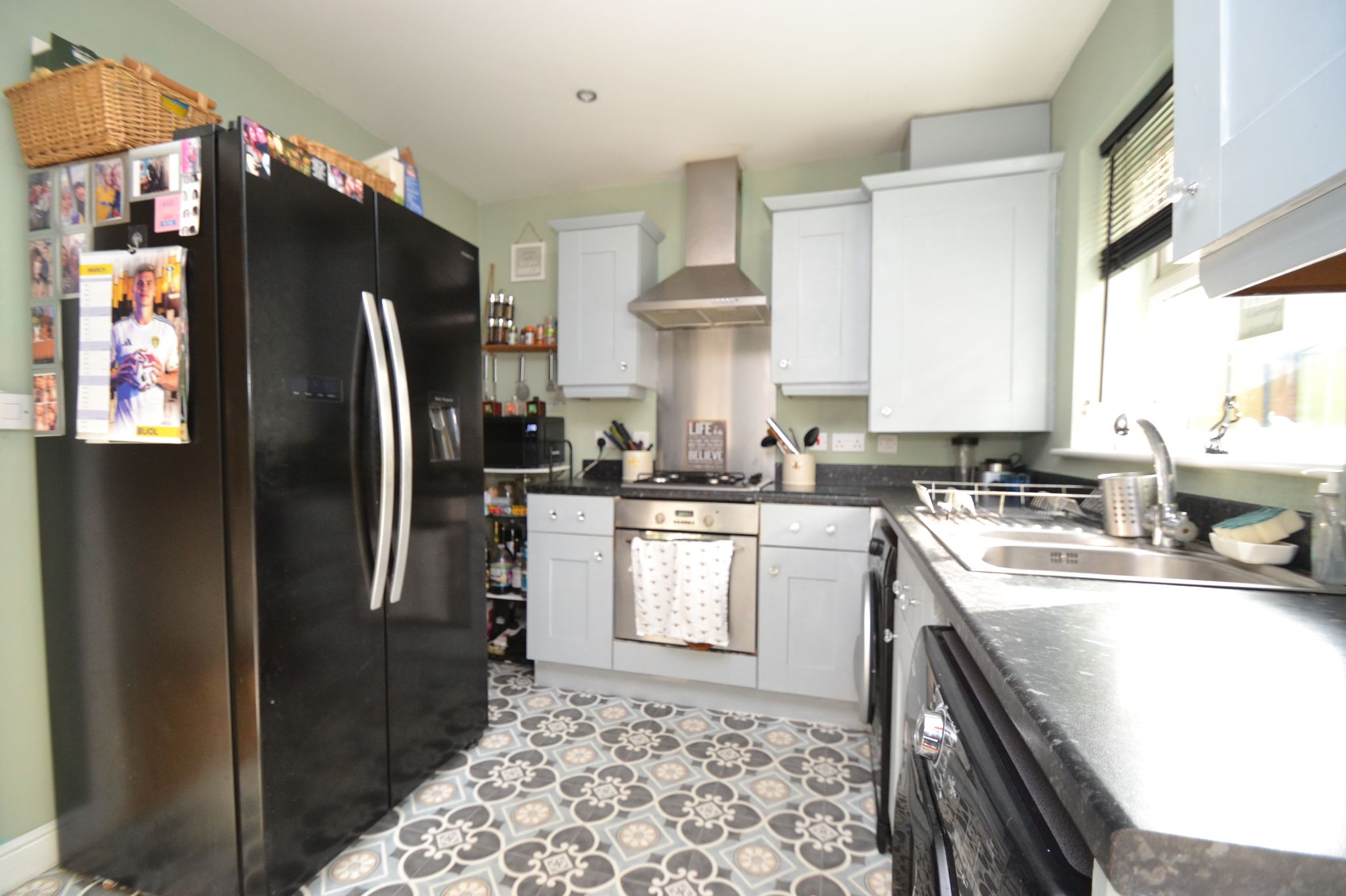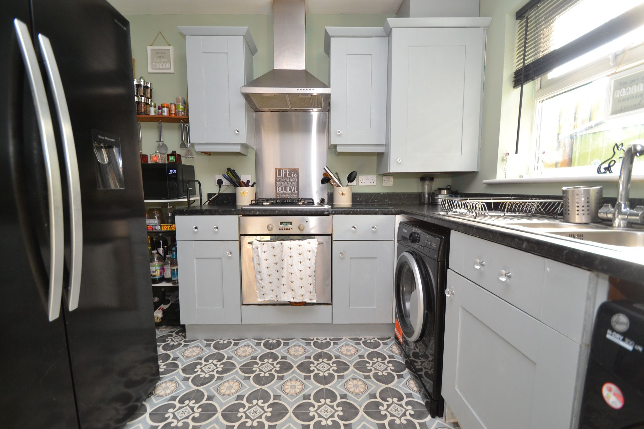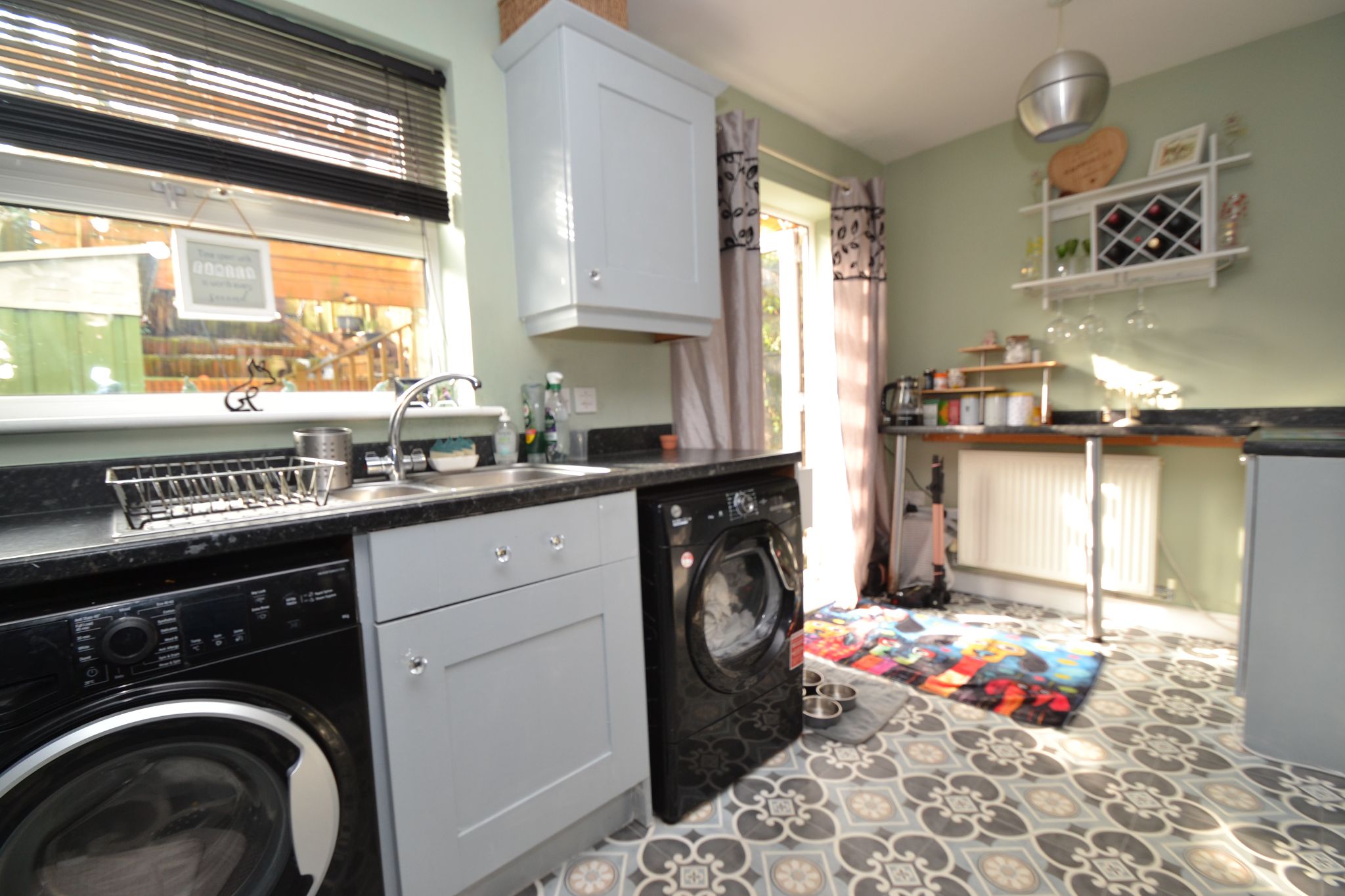 The kitchen is fitted with a good range of wall and base units in grey with contrasting work top surfaces. Incorporating a stainless steel drainer sink with mixer tap. Integrated electric oven with four ring gas hob, stainless steel splash back and extractor hood over. Space for 'American' style fridge freezer, dryer and plumbing for washing machine. The kitchen also benefits from a breakfast bar and patio doors that lead out to the rear garden, ideal when entertaining and al-fresco dining.