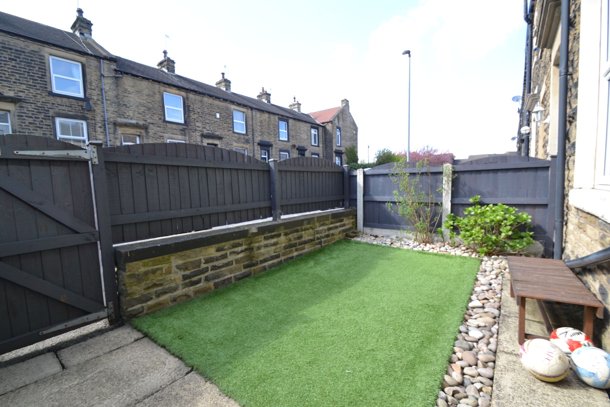 Externally: To the front is low walling with fencing and a gate leading onto a flagged pathway, artificial grassed garden area. To the rear are steps down to an enclosed flagged garden area, gated access.
