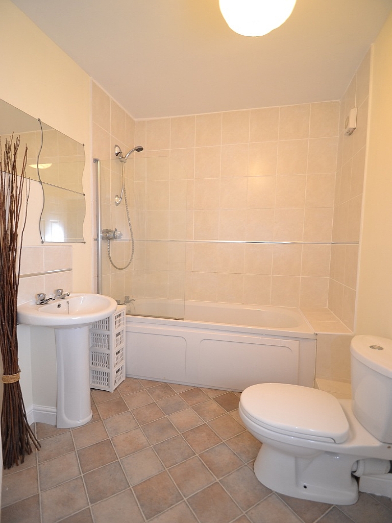 Bathroom: 8'5 x 6'5. Three piece suite in white, part tiled, extractor, chrome shower unit over the bath, glass screen, ch radiator.