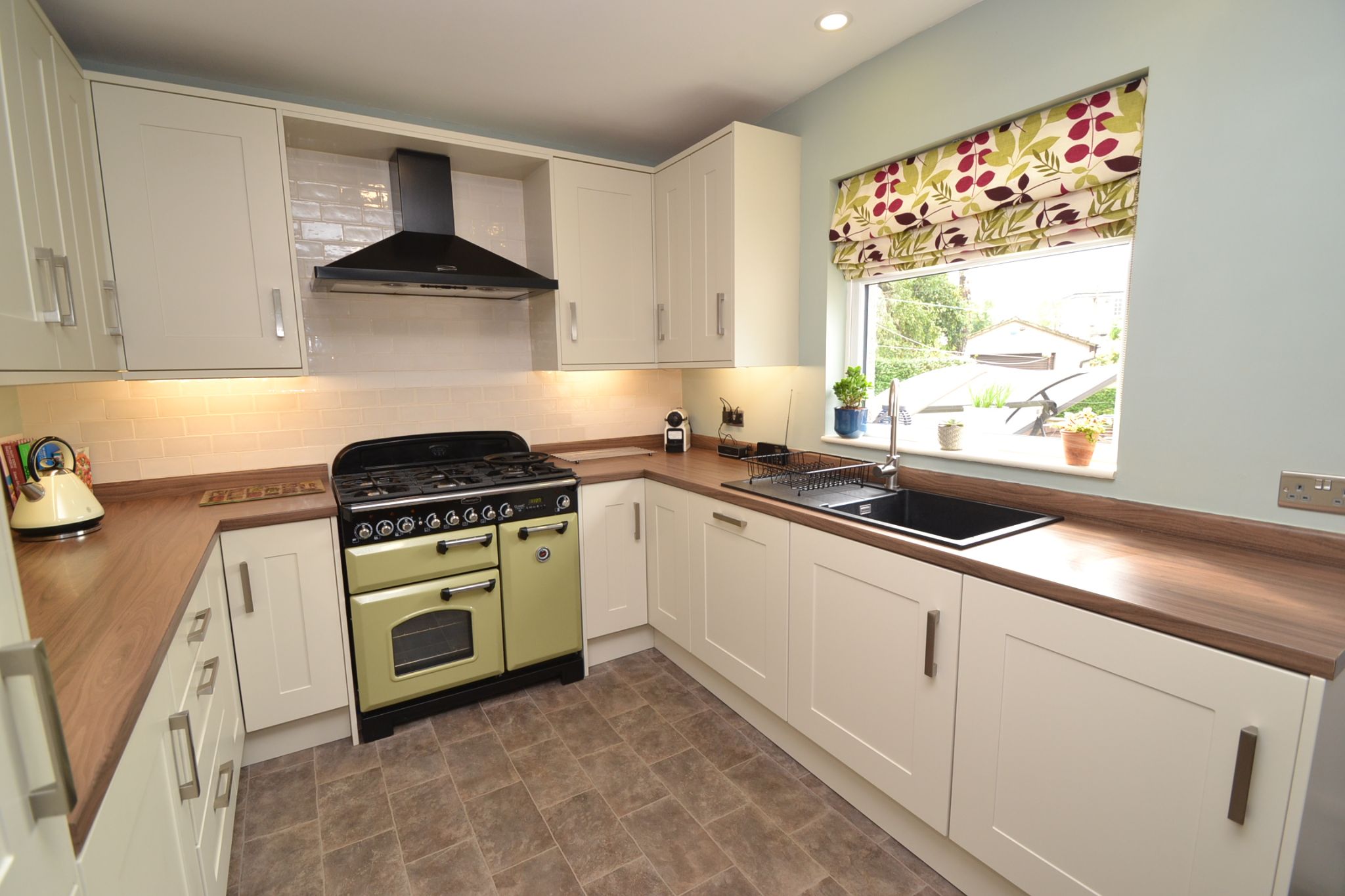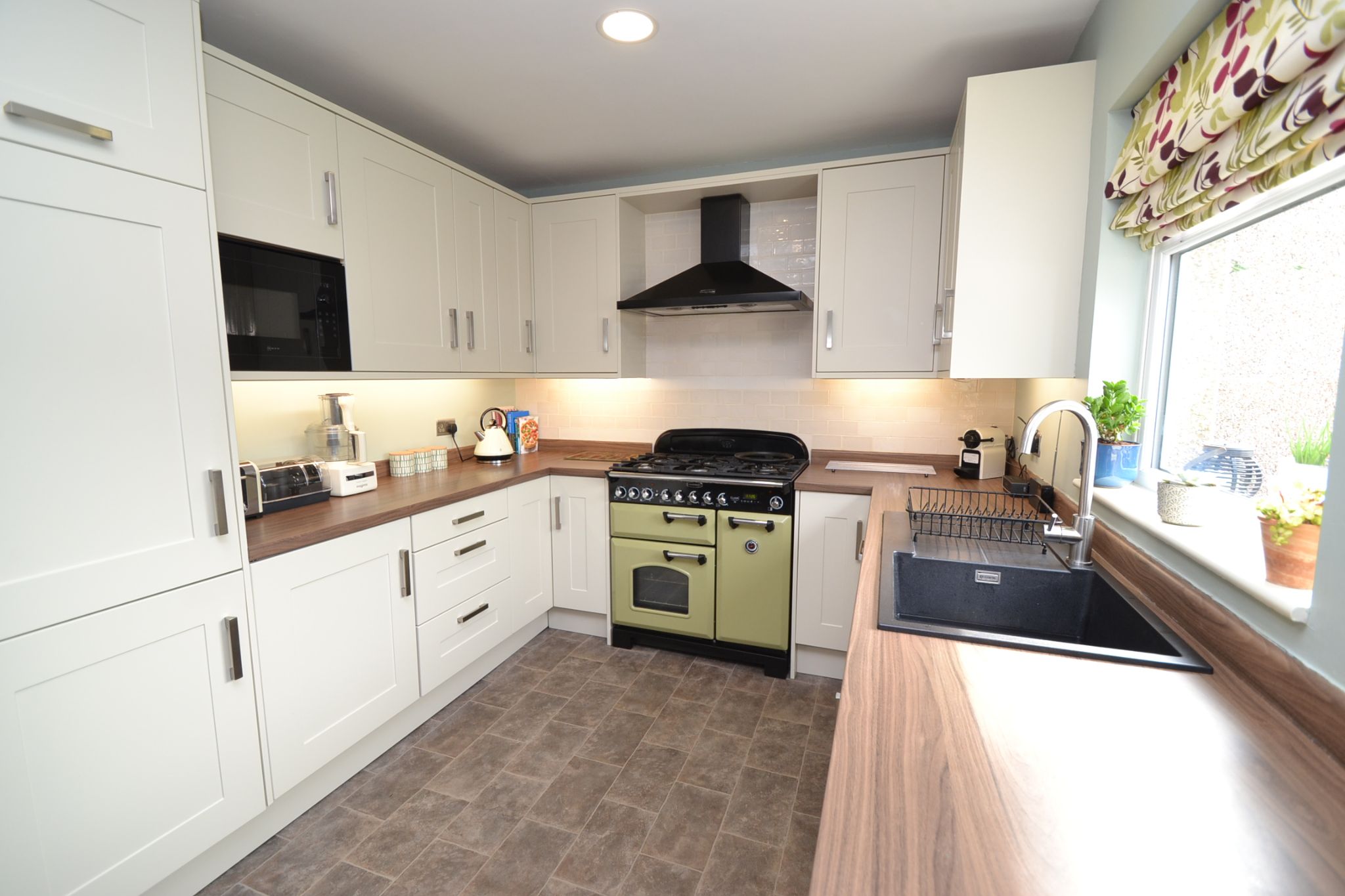 Breakfast Kitchen: 4.8m x 2.8m (15'9 x 9'1). Excellent range of modern wall & base units, work tops with matching splash backs, under lighting, brick effect tiling above, extractor hood over a housing for a cooker Range, sink with chrome tap, Upvc dg window & door to rear, built in Neff microwave, integrated fridge and freezer, integrated Bosch auto-washer and dishwasher by Blomberg, upright contemporary radiator, space for a breakfast table and chairs, pantry cupboard, storage cupboard houses the Baxi condensing boiler.