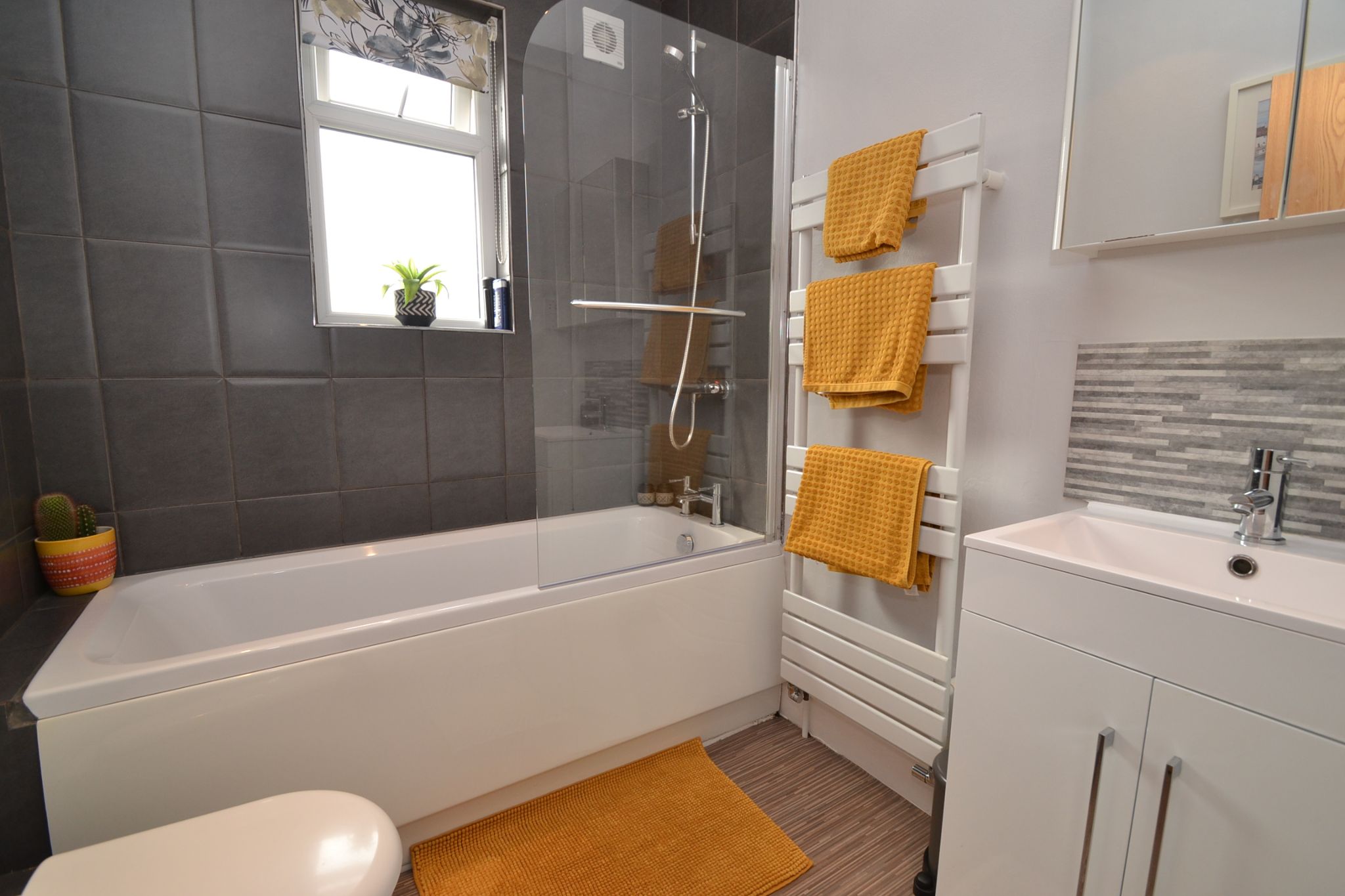 Bathroom: 2.16m x 1.82m (7'0 x 5'9). Superb modern three piece suite in white, part tiled, glass shower screen, chrome mixer tap plus a thermostatically controlled shower unit over the bath, wash basin set on a white high gloss vanity unit, frosted Upvc dg window, contemporary upright radiator plus additional radiator, inset ceiling lights, electric shaving point.