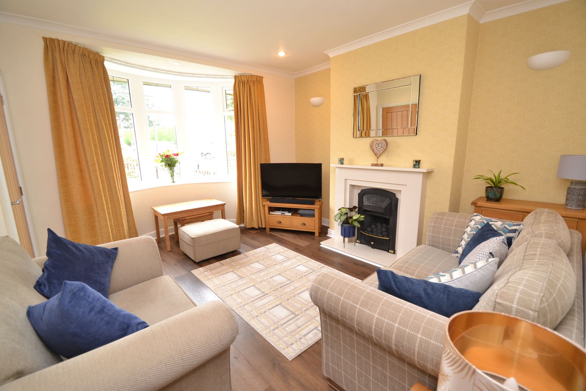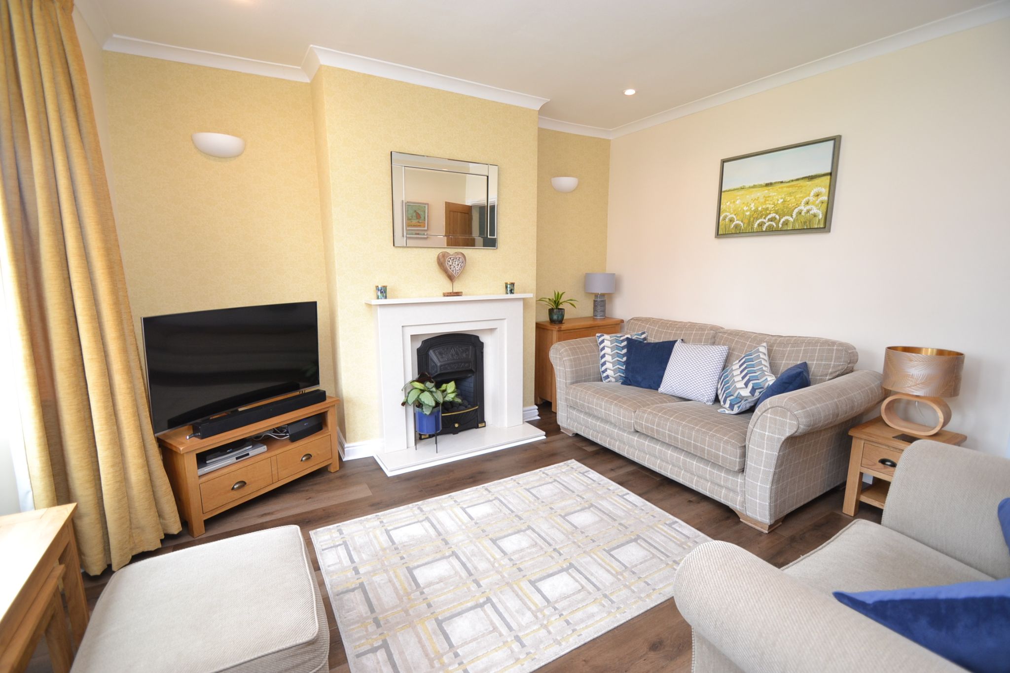 Lounge: 3.9m x 3.8m (12'8 x 12'4). Upvc dg part leaded front window, quality laminate floor, marble fire place with a living flame cast iron coal effect gas fire and touch lighting, coving, inset ceiling lights, radiator.