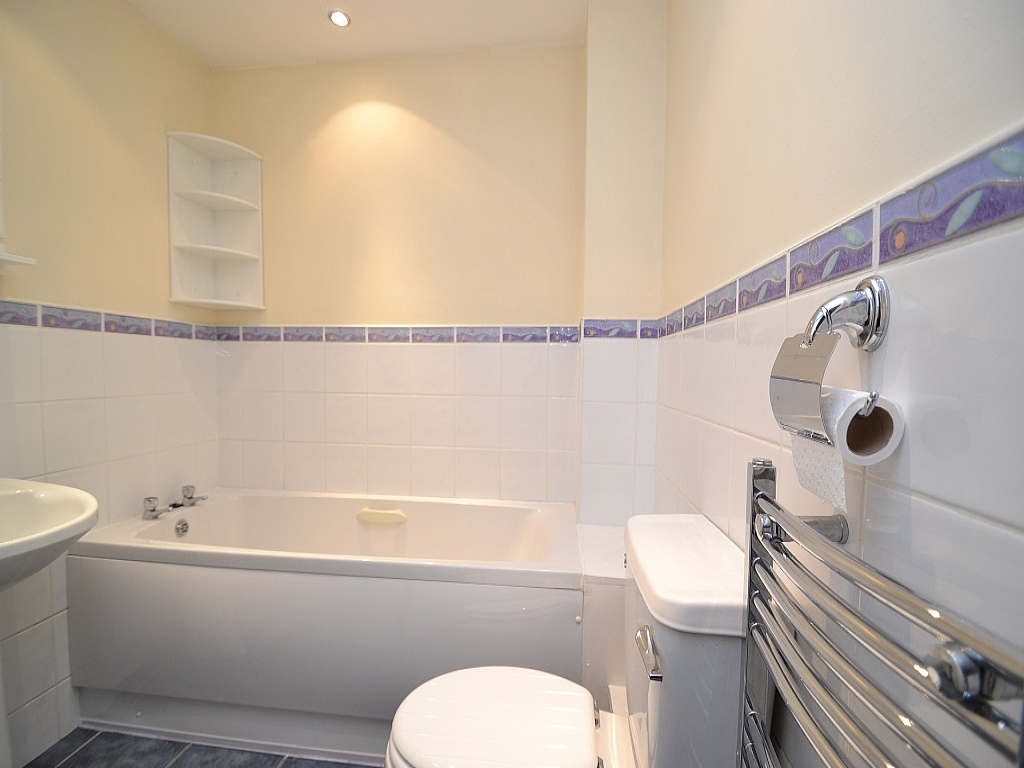 Bathroom: 7'8 x 6'7. Three piece suite in white, part tiled, chrome fittings, heated chrome towel rail, inset chrome ceiling lights extractor, separate shower cubicle with a Mira 415 unit.
