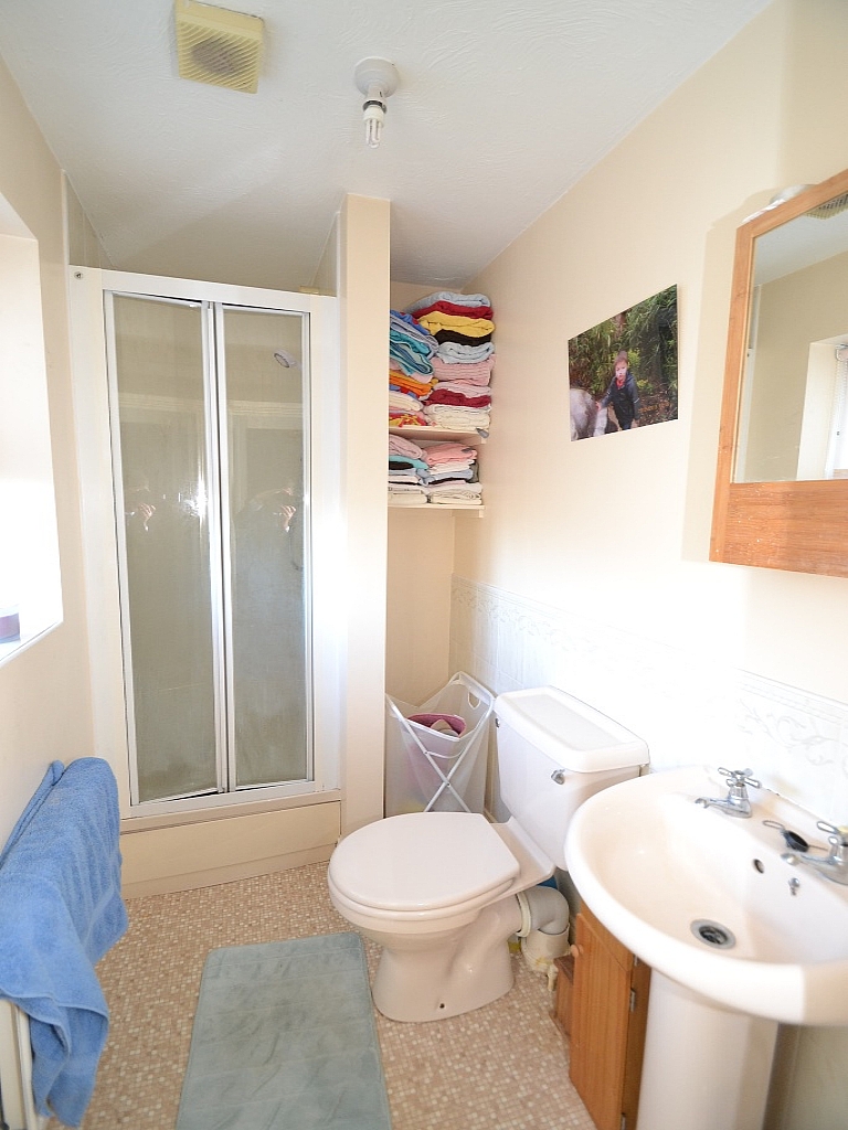En-Suite: 6'10 x 4'3. Fully tiled shower cubicle, part tiled, wc and wash basin.