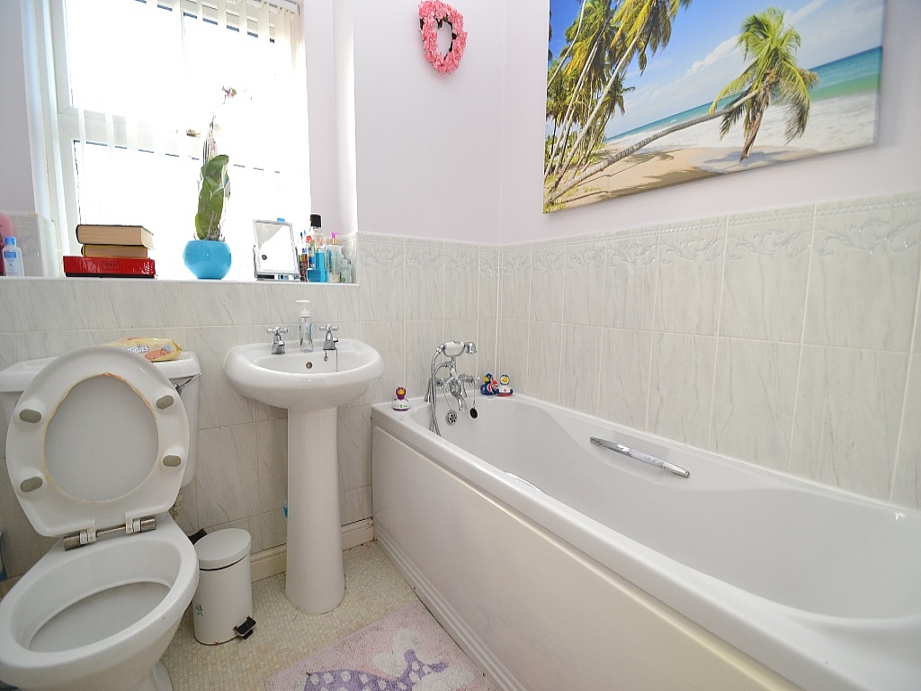 Bathroom: 6'3 x 6'2. Three piece suite in white, part tiled, integrated shower attachment to bath.