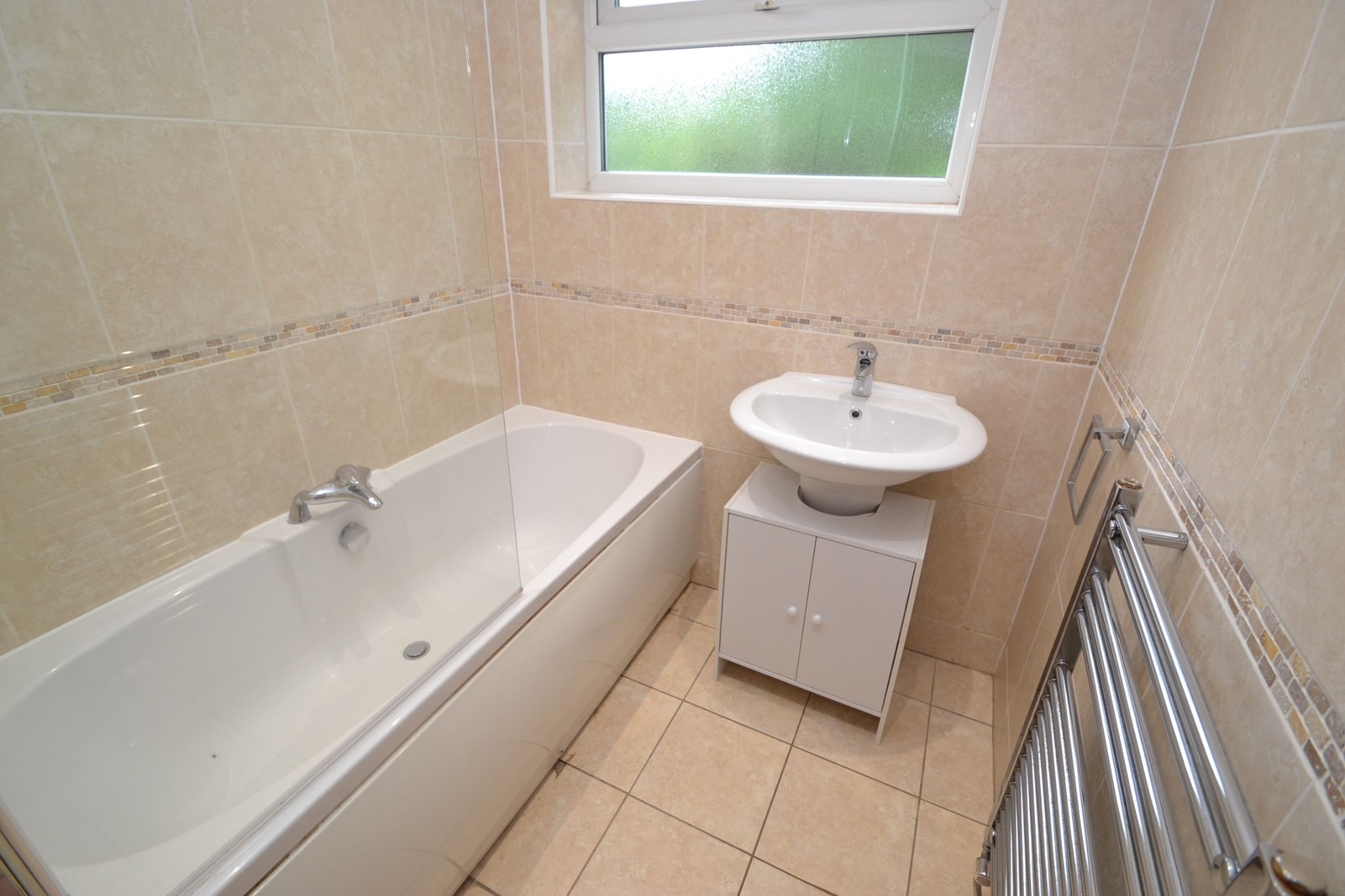 Bathroom: 2.09m x 1.73m (6'10 x 5'8). Two piece suite in white, shower glass screen with a Galaxy electric shower over the bath, wash basin set on a vanity unit, fully tiled to walls and floor, heated chrome towel rail, inset chrome ceiling lights, frosted Upvc dg window.