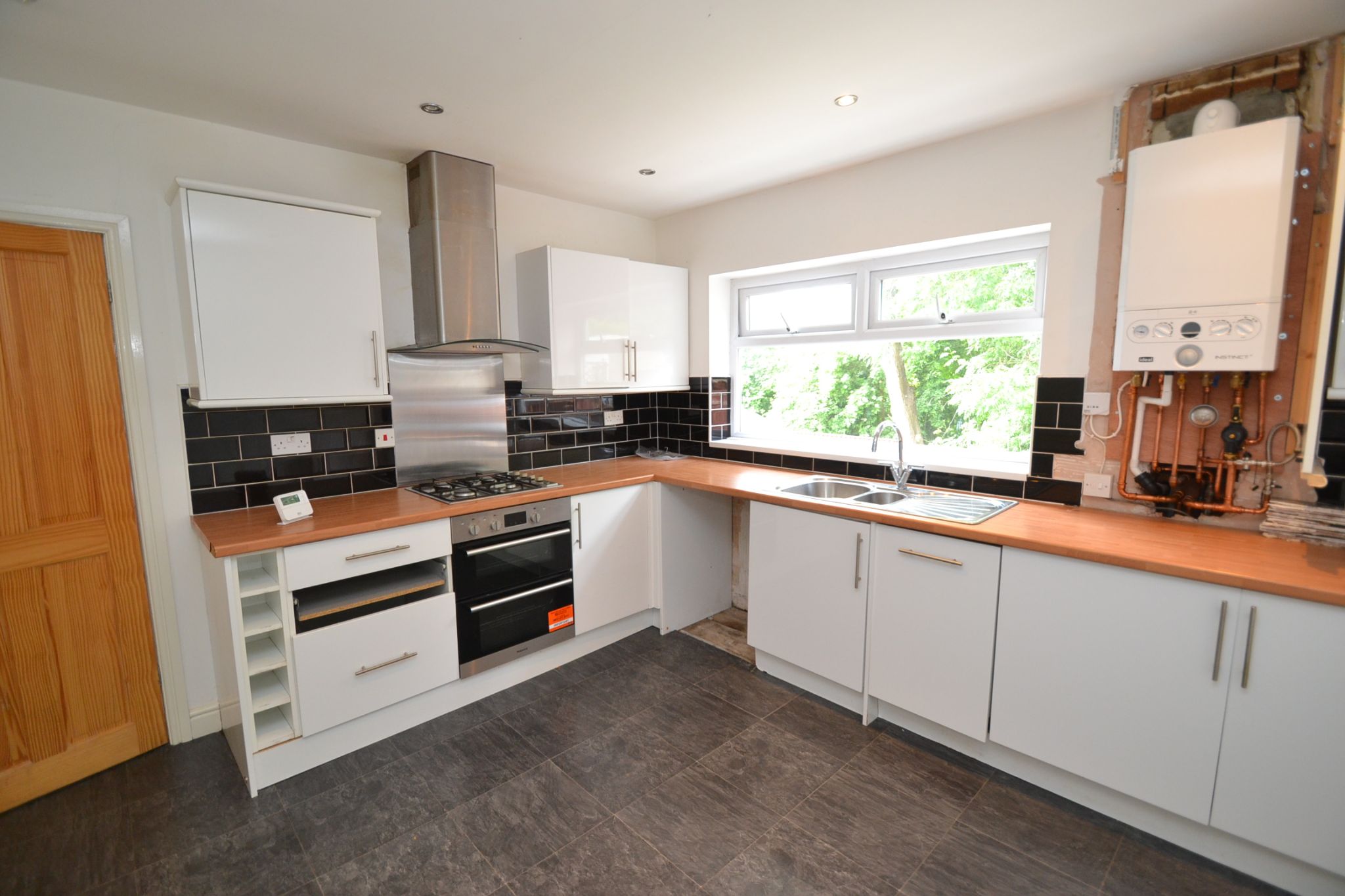 Kitchen Dining Room: 3.55m x 3.53m (11'7 x 11'6). L shaped range of wall & base units in high gloss white, work tops with black effect brick tiling above, stainless steel extractor with matching splash back, 4 ring gas hob and double electric oven all in stainless steel, integrated slim line dishwasher, plumbed for an auto-washer, integrated fridge and freezer, newly installed Ideal Instinct 2 condensing boiler, 1.5 stainless steel sink, rear Upvc dg window, inset chrome ceiling lights, useful under stairs storage cupboard.