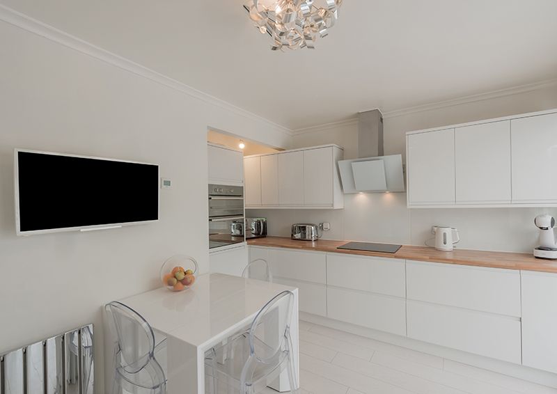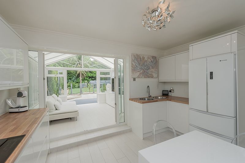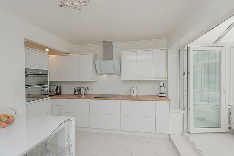 Kitchen Diner: 13' 0" x 12'6 (3.96m x 3.86m). Excellent range of wall & base units in high gloss white with butcher wood work effect tops, built in double electric oven, ceramic 4 ring hob with an extractor over and a glass splash back, integrated Bosch dishwasher, stainless steel bowl and sink drainer with an extendable adjustable tap, space for a breakfast table and chairs, housing for a large American style fridge freezer, radiator, laminate floor, Upvc dg French doors lead onto:-