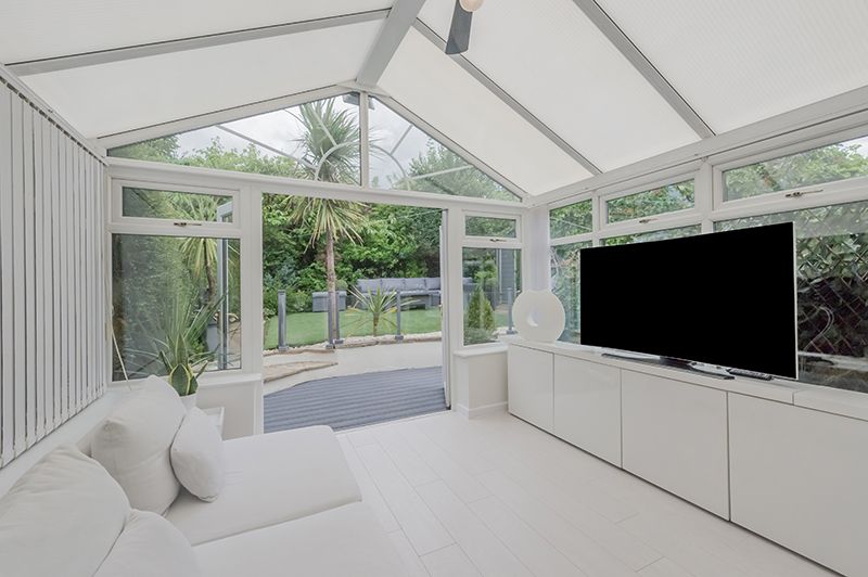 Upvc dg Conservatory: 10' 8" x 10' 0" (3.25m x 3.05m). Laminate floor, fitted blinds, ceiling light fan unit, French doors to the rear.