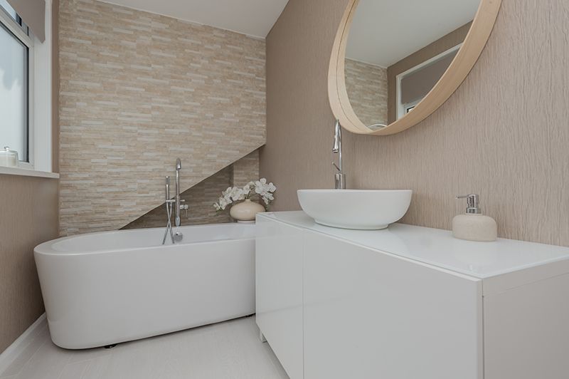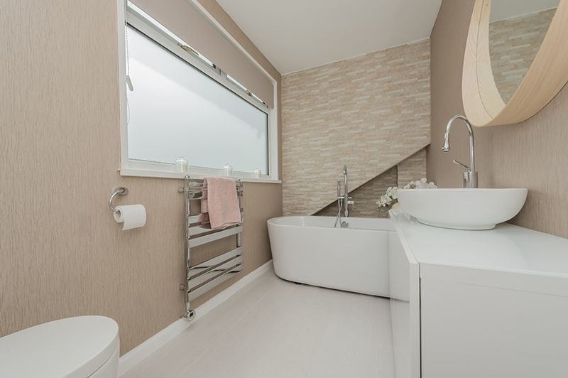 Bathroom: 9' 9" x 5'5 (3.02m x 1.66m). Free standing bath in white with an upright free standing chrome shower tap, frosted Upvc dg window, feature stone tiling, chrome heated towel rail, wc in a cistern tank unit, wash basin set on a vanity unit, laminate floor.