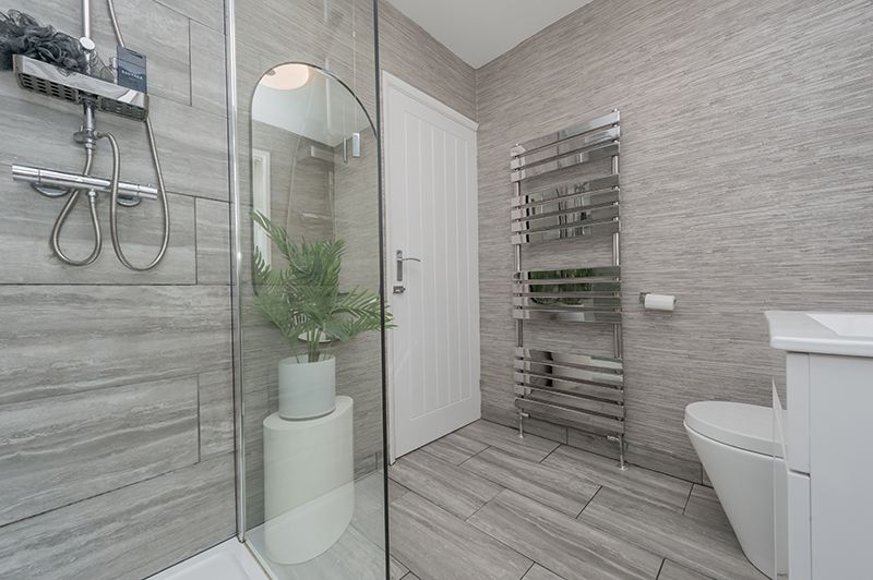 Shower Room: 5' 10" x 7' 5" (1.78m x 2.26m). Shower cubicle with a glass screen, chrome thermostatically controlled shower unit, wash basin set on a high gloss vanity unit, wc, part tiled, frosted Upvc dg window, contemporary heated towel rail.