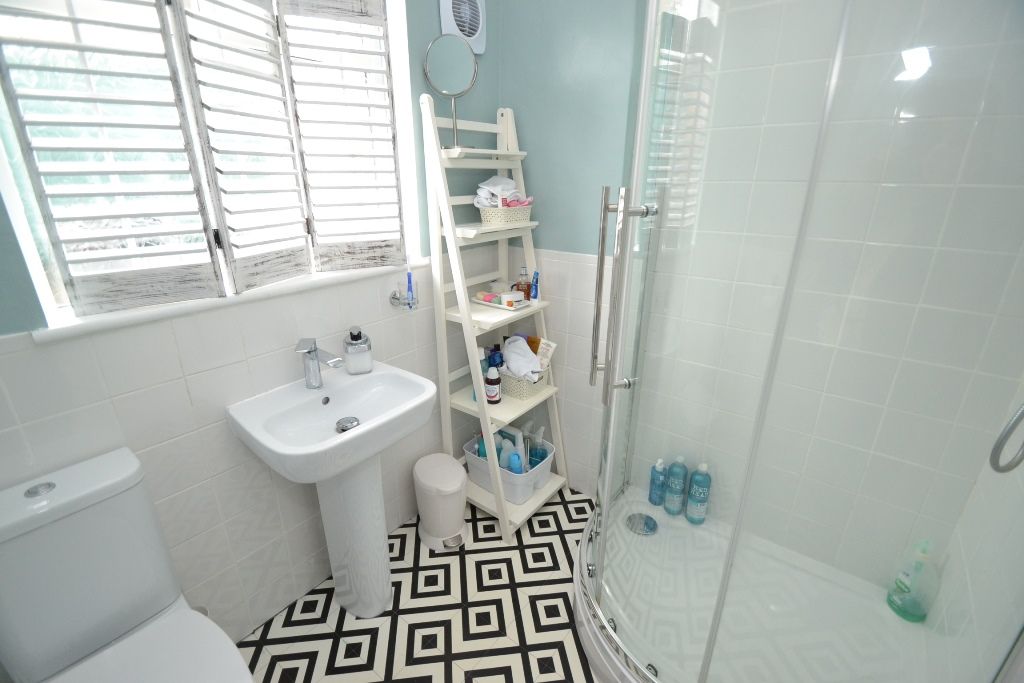 Shower Room: 1.97m x 1.67m (6'6 x 5'5). Wrap around modern shower cubicle with a chrome thermostatically controlled shower unit, wash basin and wc in white, frosted Upvc dg window, part tiled, extractor.