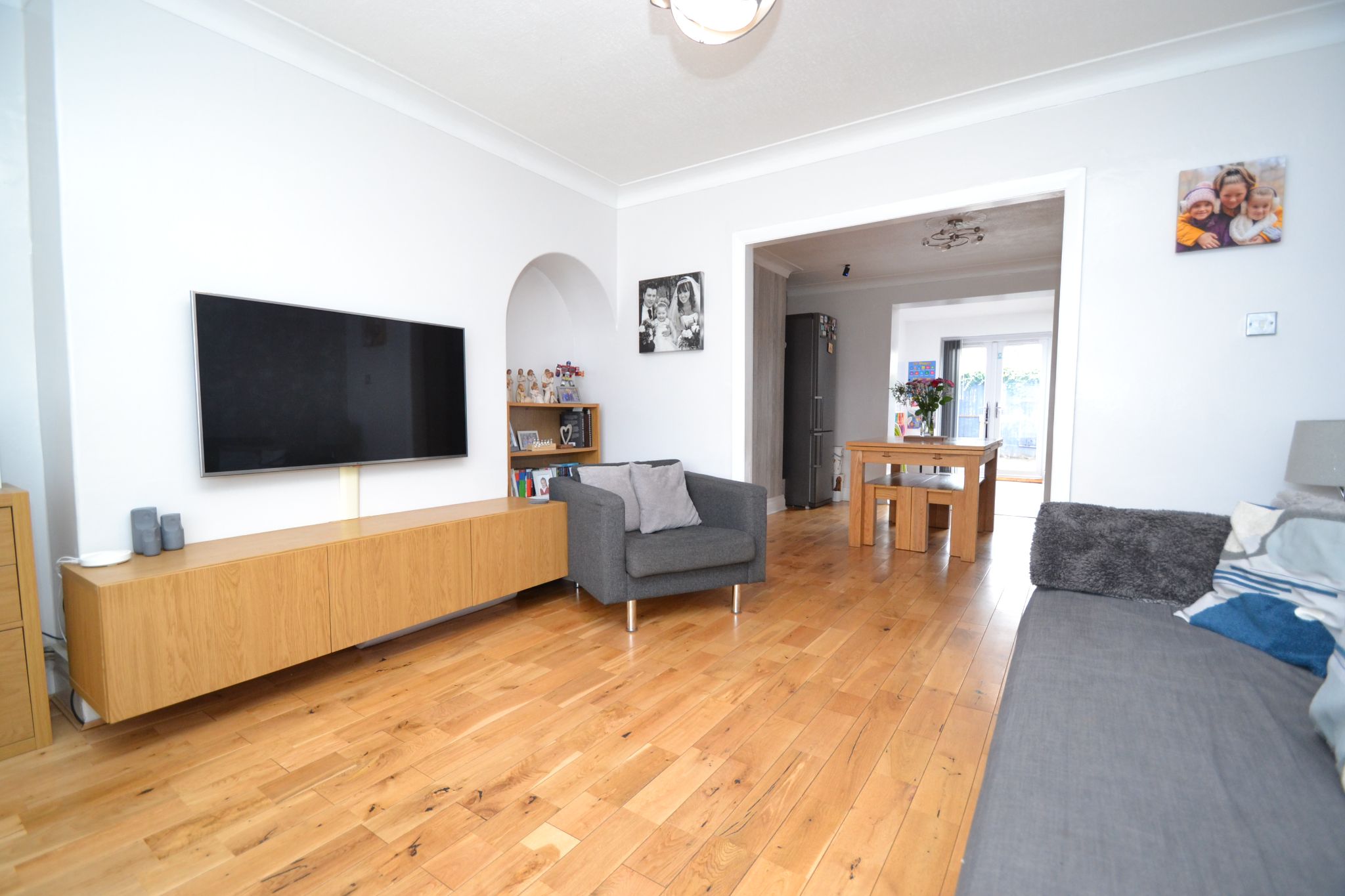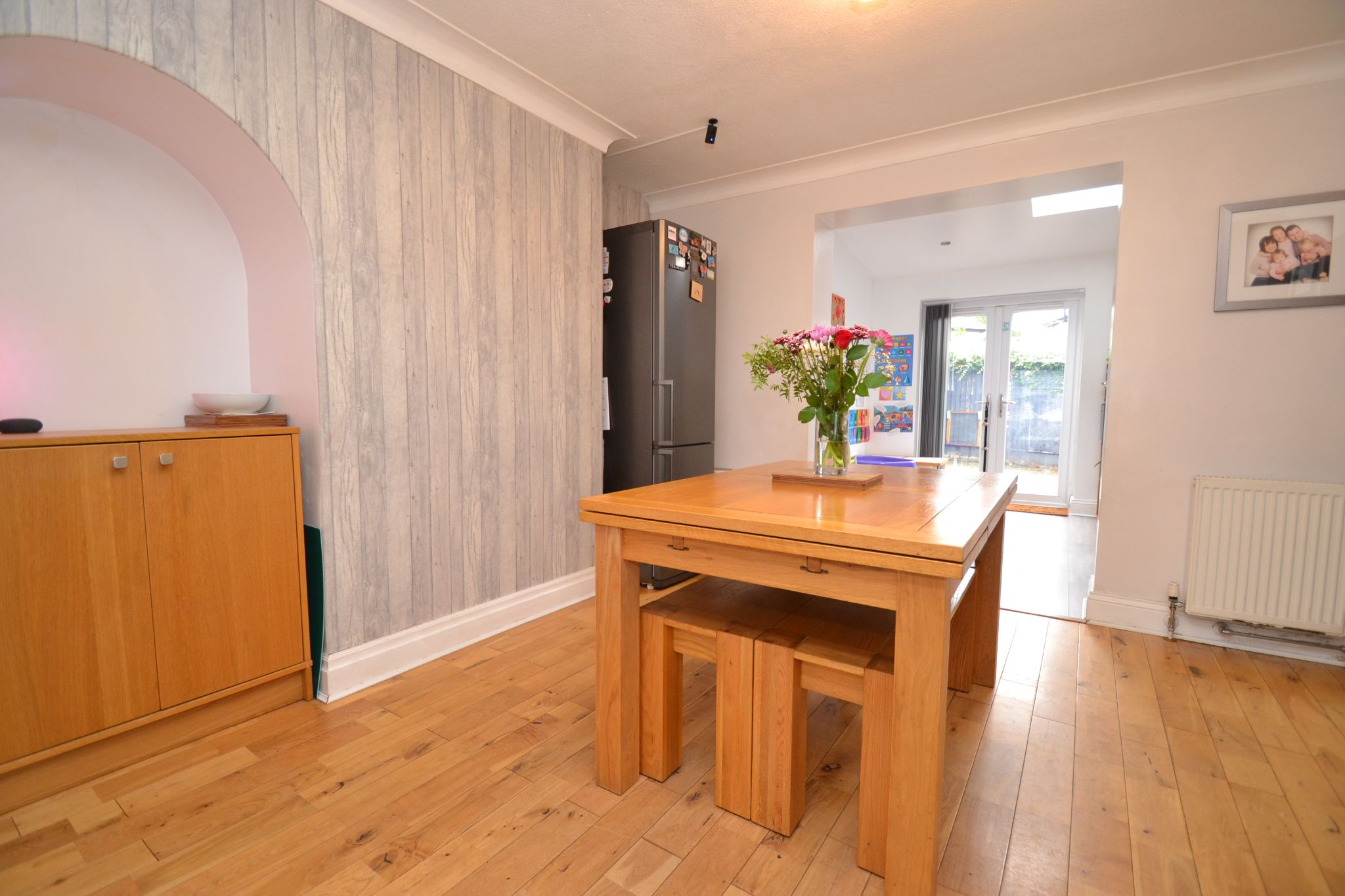Extended Reception Room 3: Inset ceiling lights, dome skylight, laminate plank effect flooring in grey, upright contemporary anthracite radiator, Upvc dg French doors lead out to the rear garden.