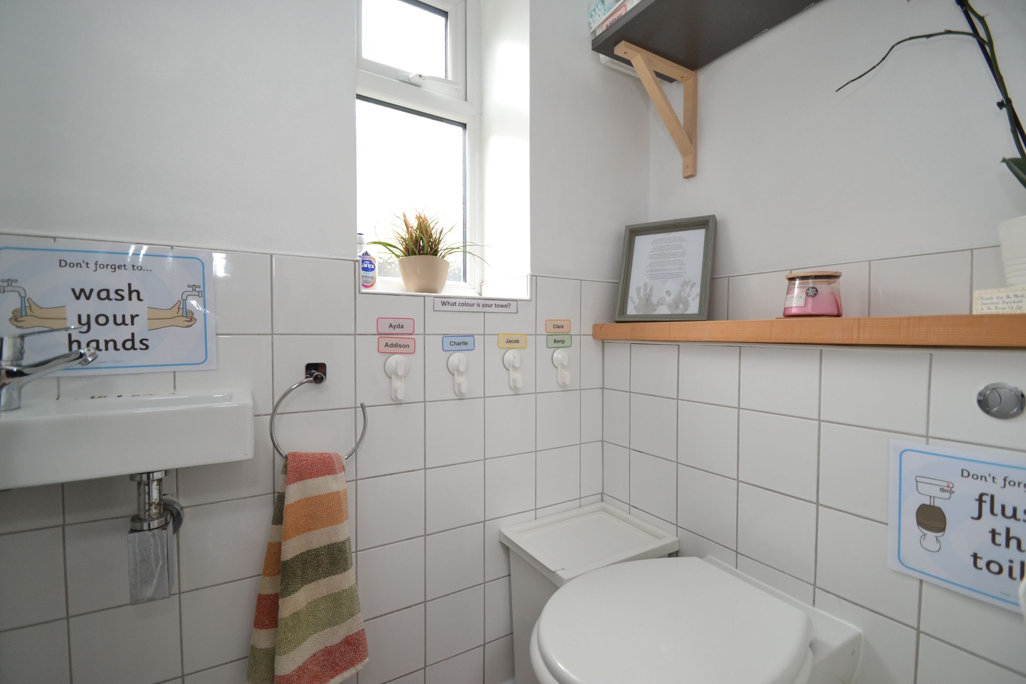 Downstairs Cloaks: Wc and wash basin in white, part tiled, frosted Upvc dg window, laminate flooring in plank effect grey.