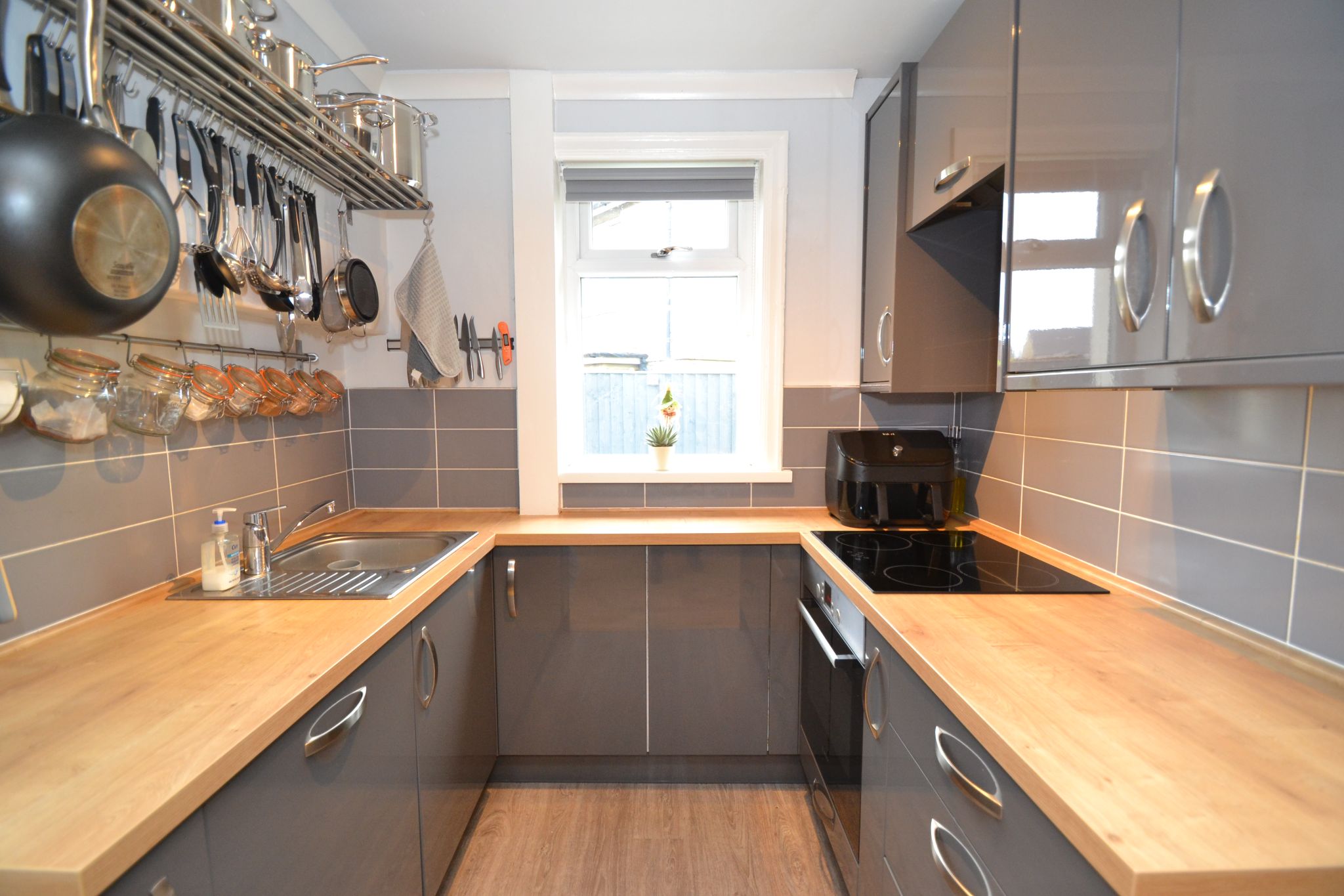 Kitchen: Modern range of wall & base units in high gloss grey, work tops with tiilng above, extractor and light over a 4 ring induction hob by Belling, built in stainless steel electric oven by Bosch, integrated dishwasher, stainless steel sink with a chrome mixer tap, click vinyl flooring, stainless steel pan rack, side Upvc dg window with a roller blind.