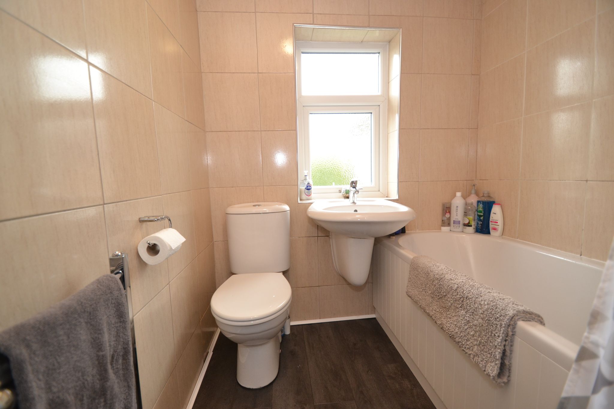 Bathroom: Three piece suite in white, full tiling in stone effect tiling, shower rail and curtain with a chrome thermostatically controlled shower unit over the bath, heated chrome towel rail, frosted Upvc dg window, airing cupboard houses the Vokera condensing combi-boiler.