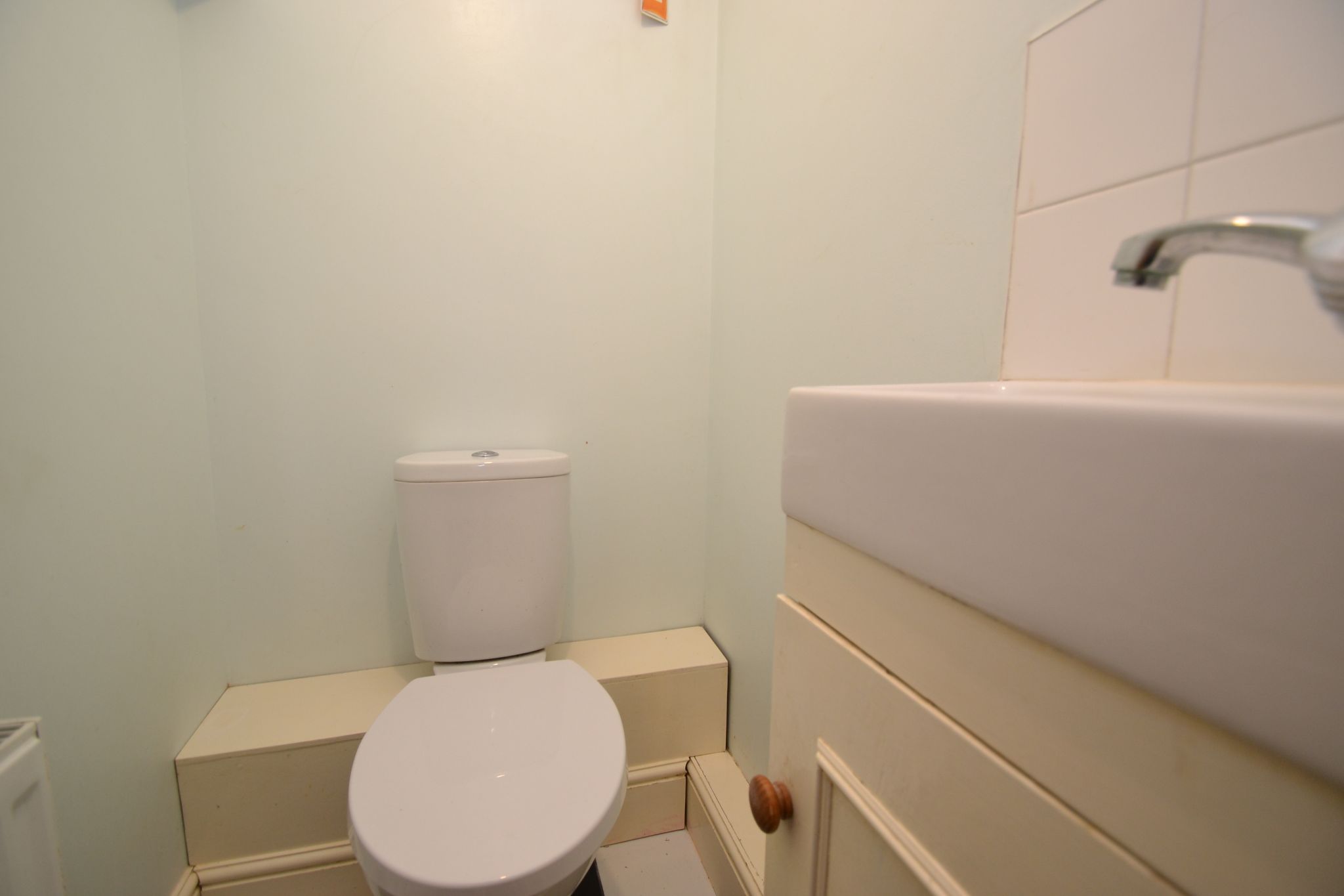 Cloaks: Wc in white, extractor, radiator, wash basin on vanity unit.