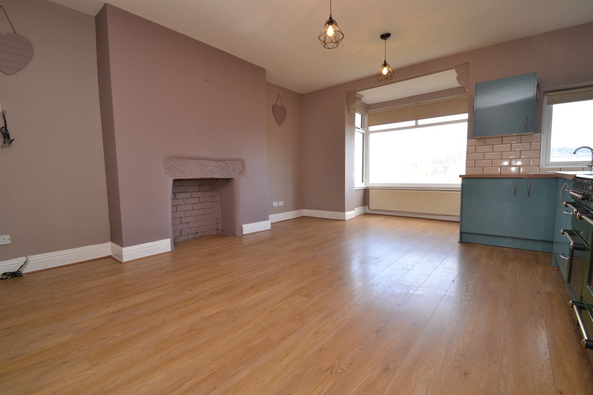 Lounge Dining Room and Kitchen: 6.29m x 4.67m (20'8 x 15'4). Upvc dg window to front, original cornice and ceiling rose, Upvc dg bay window to rear with extensive views from here, feature display fireplace, two radiators.  The kitchen has a range of modern base units with butcher block effect work tops and white brick tiling effect above, Range Master 110 Leisure range and double extractor over, Upvc dg window to rear, sink in white with chrome mixer tap, internal door leads down to the:-
