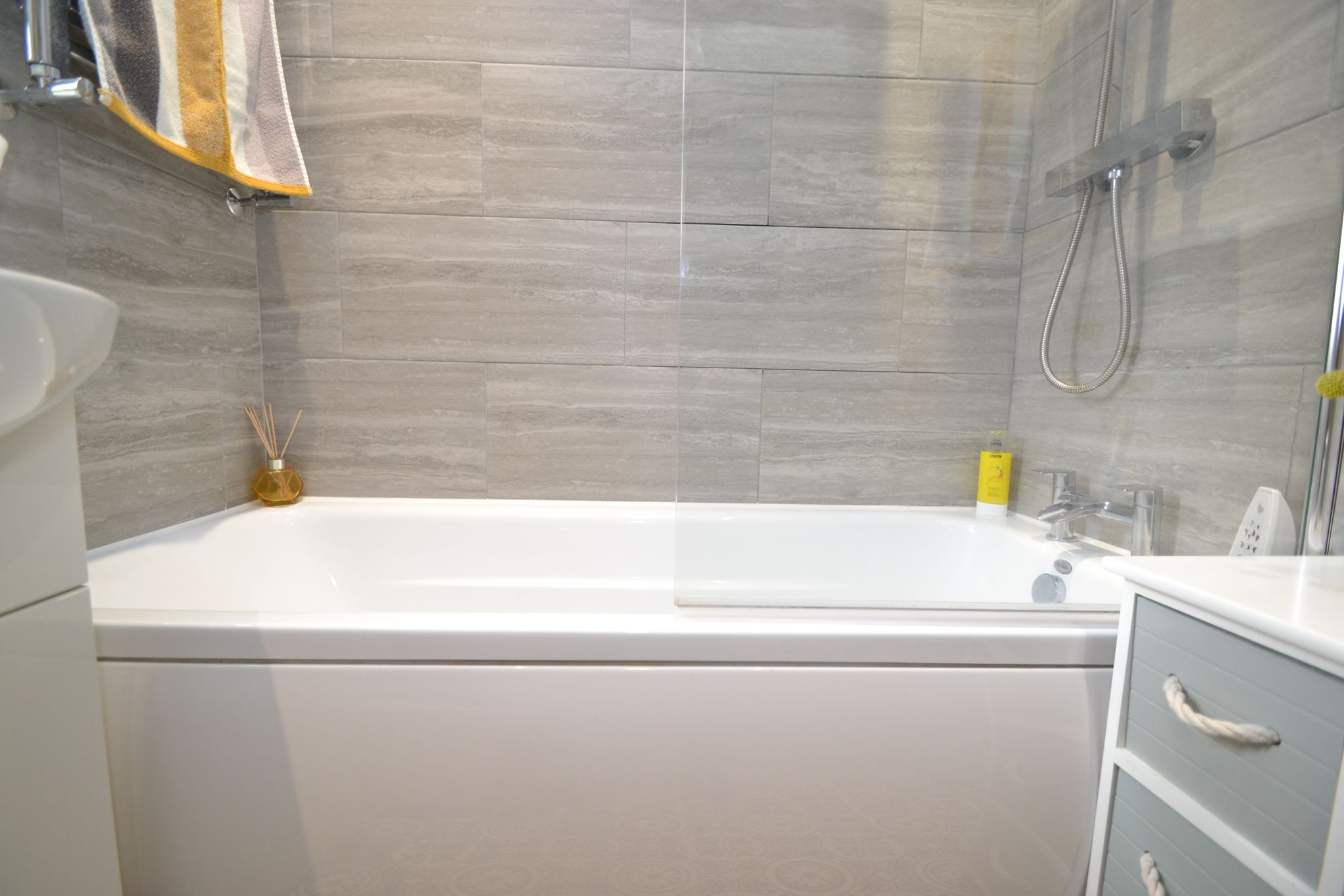 Bathroom: Three piece suite in white, fully tiled in grey, chorme fittings, shower glass screen, chrome thermostatically controlled shower unit over the bath with a rainhead and hand attachment, wash basin set on a high gloss vanity unit, heated chrome towel rail, frosted Upvc dg window, extractor, Upvc cladded ceiling with lighting, vanity mirror.