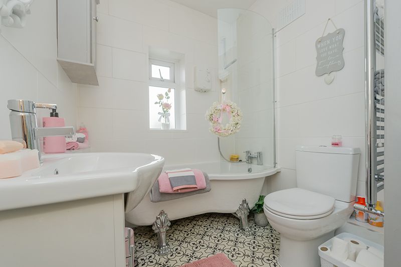 Bathroom: Three piece fitted suite in white with a bath on cast iron lion styled legs, shower glass screen with a chrome mixer tap and electric shower over the bath, frosted Upvc dg window, fully tiled, heated chrome towel rail, wash basin set on a high gloss vanity unity, airing cupboard houses the combi-boiler.