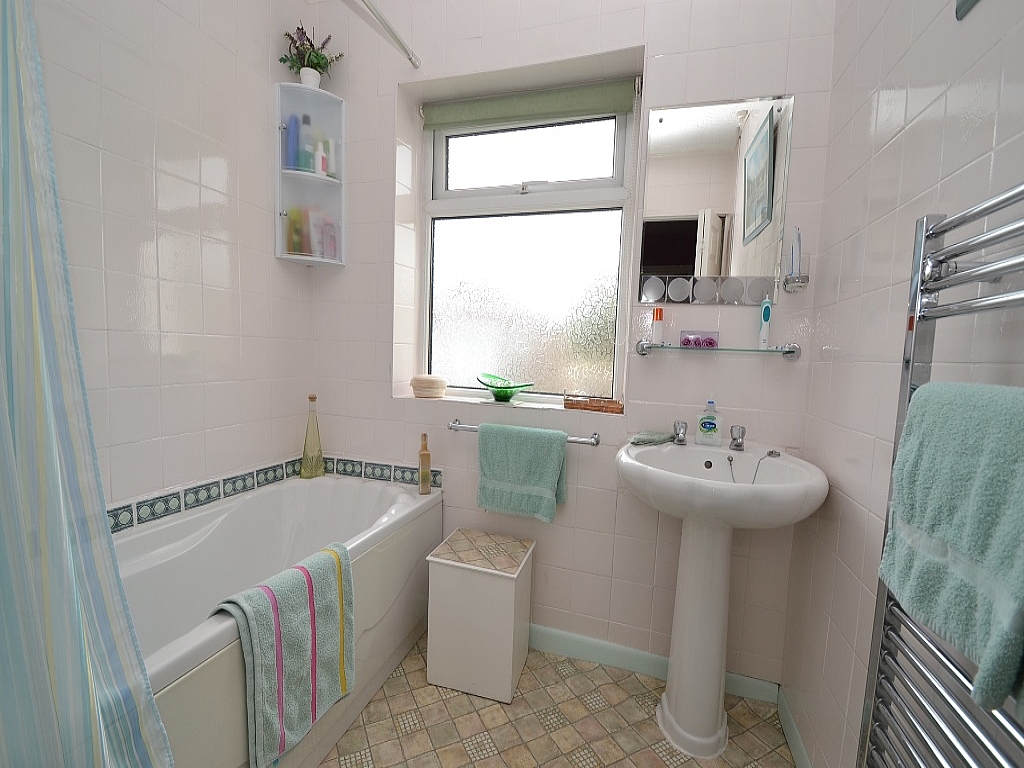 Bathroom: 6'9 x 6'9. Two piece suite in white, fully tiled, chrome shower unit over the bath, rail & curtain, frosted Upvc dg window to front, heated chrome towl rail.