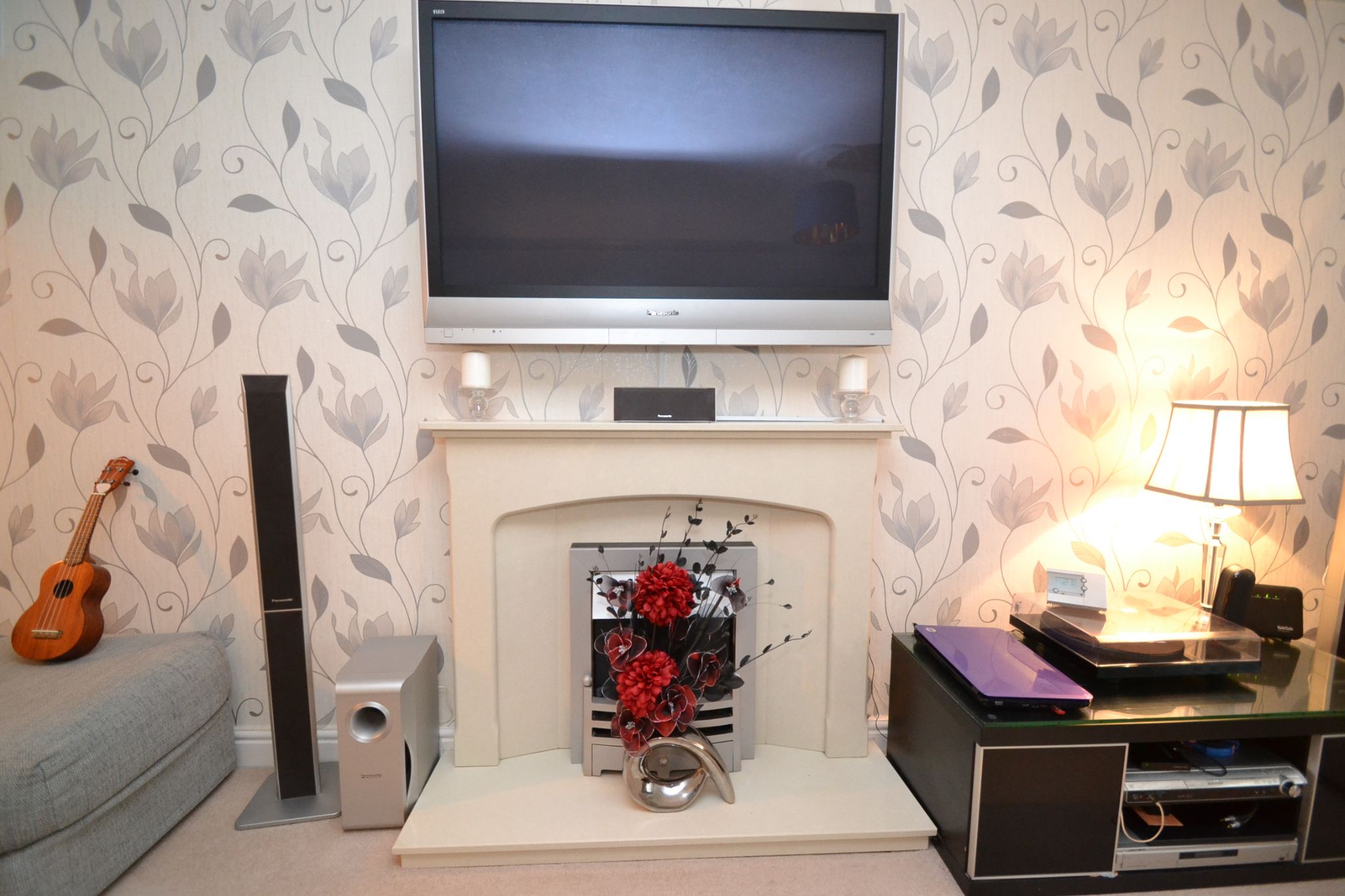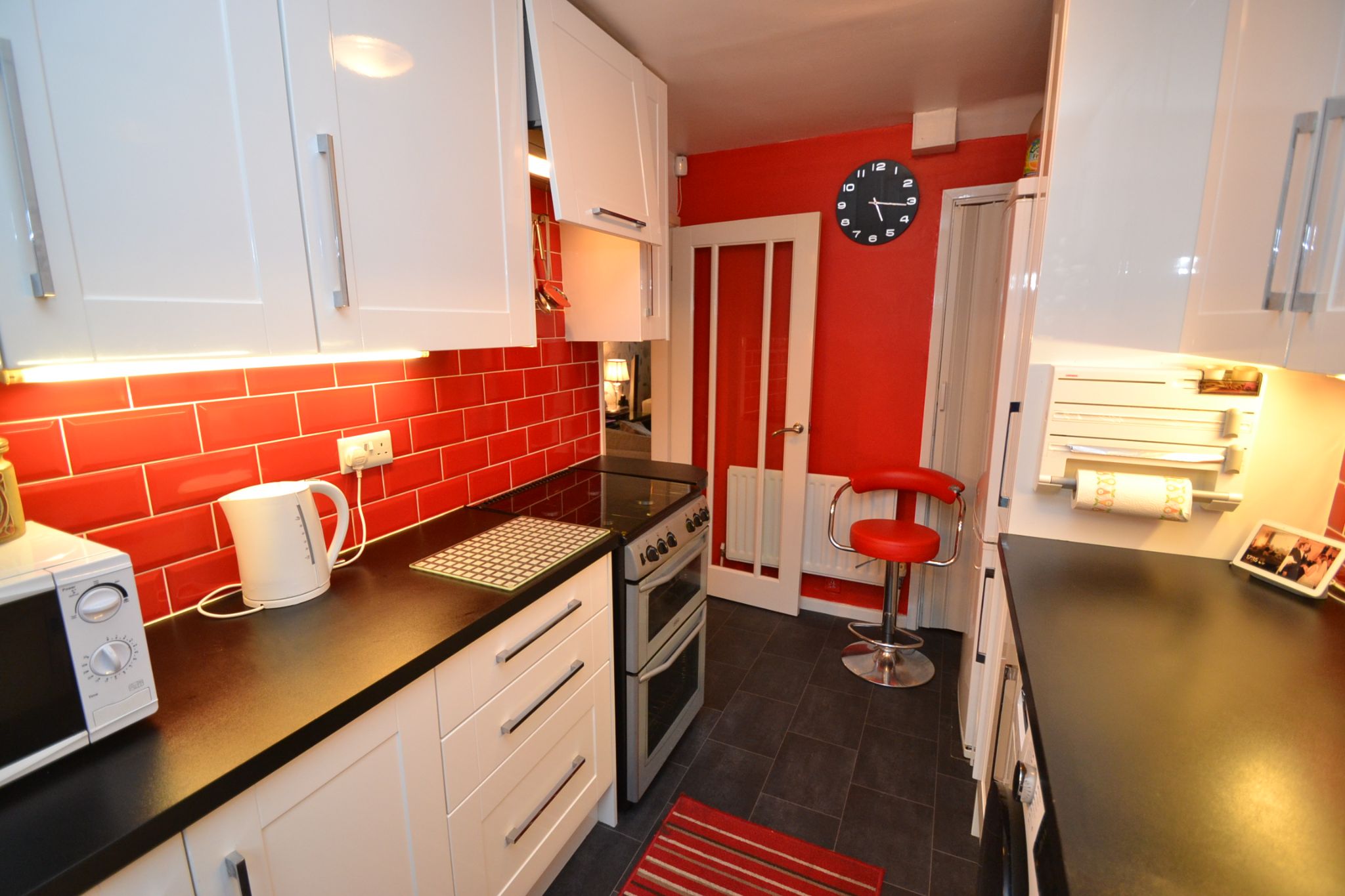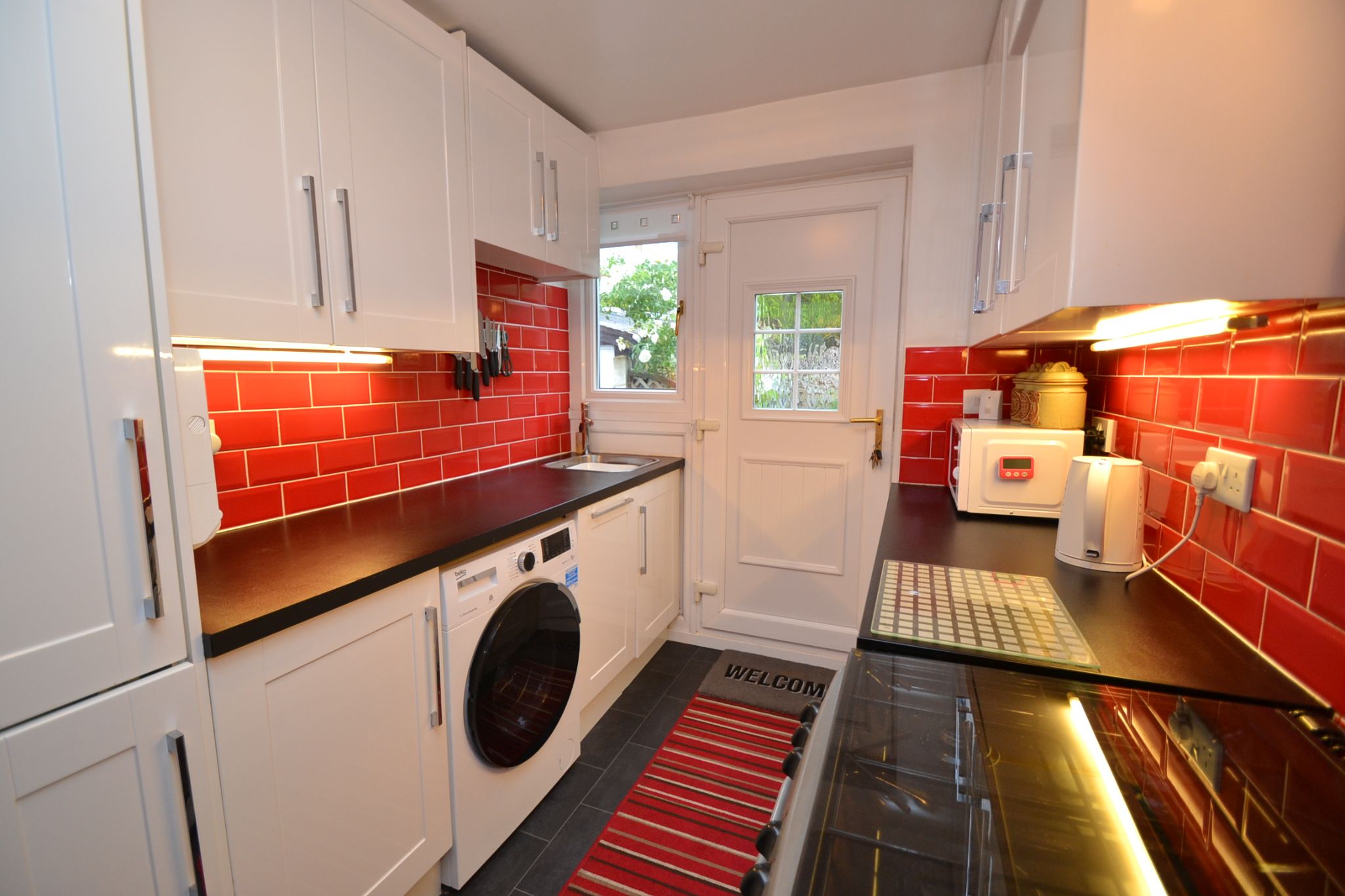 Kitchen: Range of wall & base units in high gloss white with stainless steel handles, granite effect work tops and attractive red brick tiling over and under lighting, extractor and light over a housing for a gas cooker, plumbed for an auto-washer and integrated dishwasher, space for a tall boy fridge freezer, stainless steel inset sink, radiator, pantry cupboard with the condensing boiler, rear Upvc dg door and window.