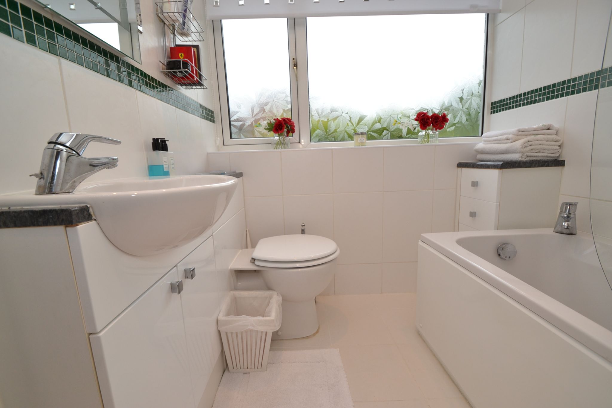 Bathroom: Three piece Jacuzzi air bath with contrasting tiling, shower screen and chrome thermostatically controlled shower unit over the bath, wash basin and wc enclosed in a vanity unit in high gloss white with additional towel cupboard, heated chrome towel rail, inset chrome ceiling lights, touch light vanity mirror, shaving point, frosted Upvc dg window with fitted blind, extractor.