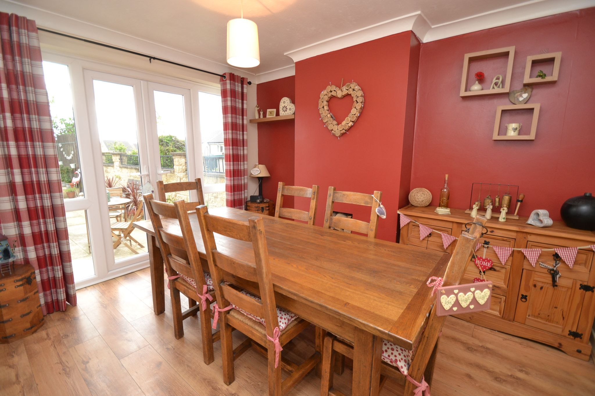 Dining Room: 3.61m x 2.97m (11'8 x 9'7). Upvc dg French doors to rear, radiator, log effect display fire, coving, plank effect laminate floor, room for a large table and chairs.
