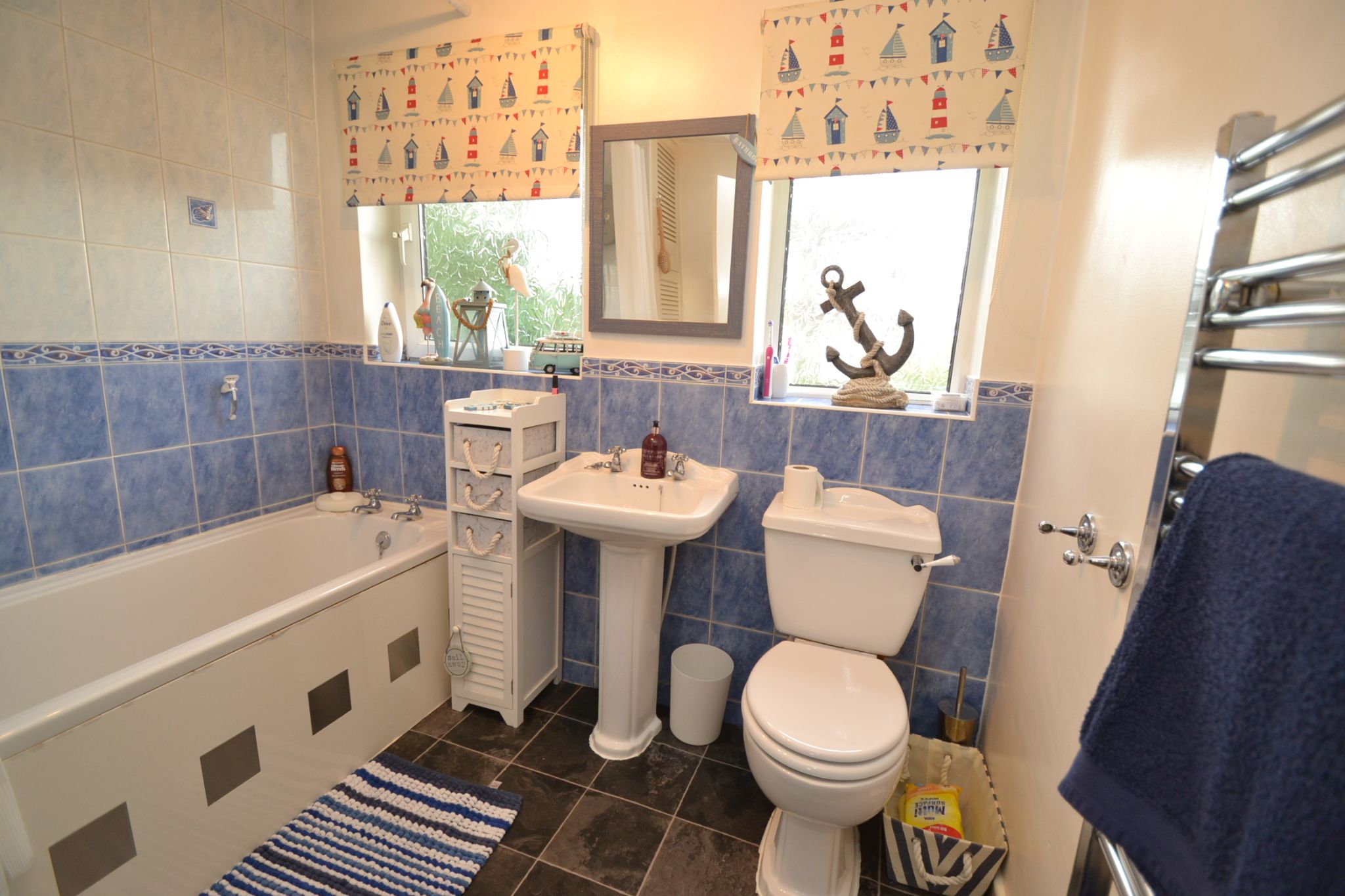 Bathroom: 2.31m x 2.25m (7'5 x 7'3). Three piece suite in white, electric shower over the bath with a rail and curtain, part contrasting tiling, two frosted Upvc dg windows, heated chrome towel rail, linen cupboard.